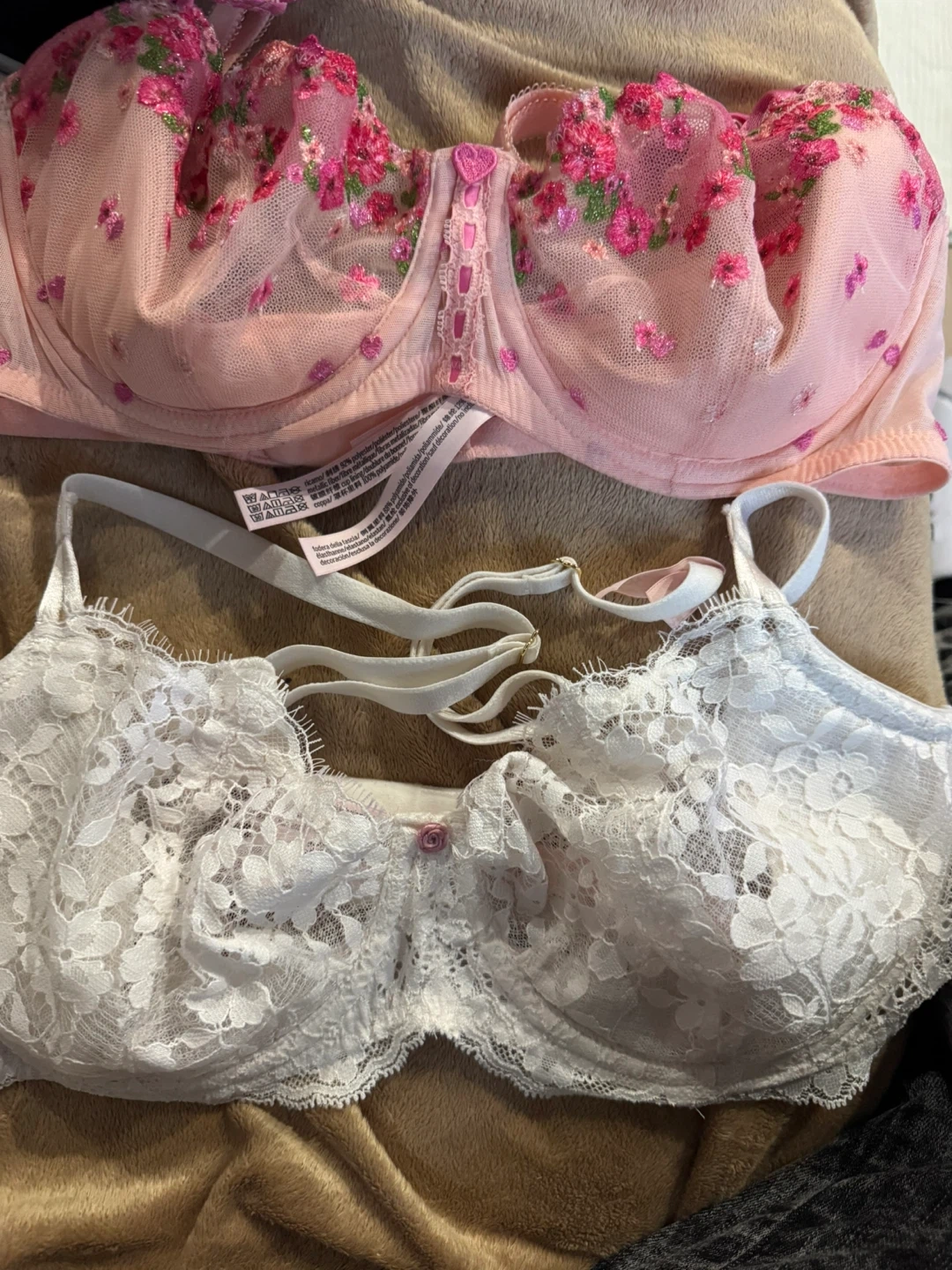 Pink Floral and White Lace Bras