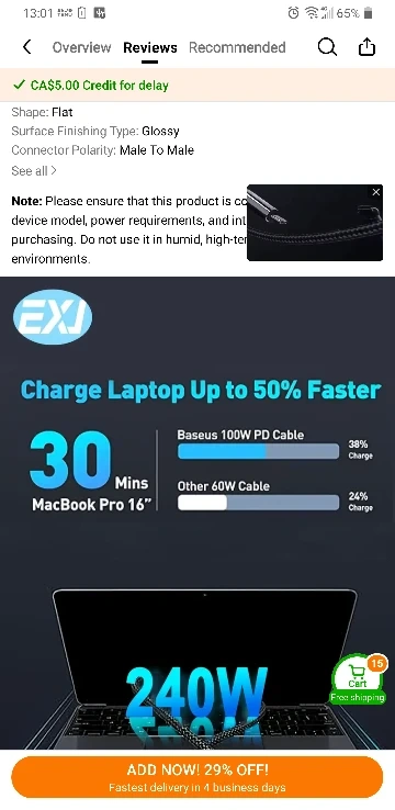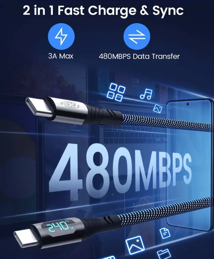 USB-C to USB-C cable. Supports fast charging up to 240W. Data transfer speeds up to 480 Mbps. Compatible with various devices, including smartphones, tablets, laptops, and more. Durable braided design. Male to male connector.