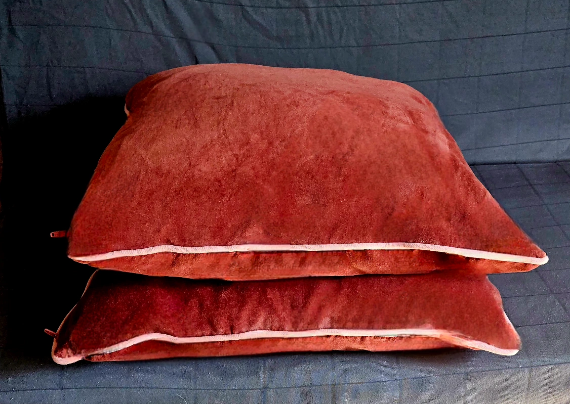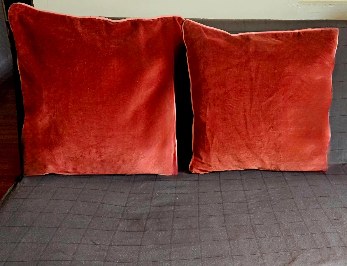 1000+Two rust-coloured velvet throw pillows. Soft texture. Subtle light pink piping. Great for adding a touch of colour to your living room. 20 x 20 inches. From a smoke-free, pet-free home. Bundle discounts are available—feel free to browse my other listings. Thanks for looking! 😊🙏