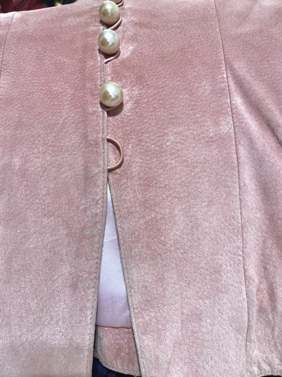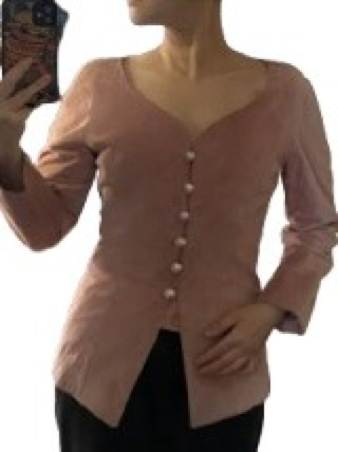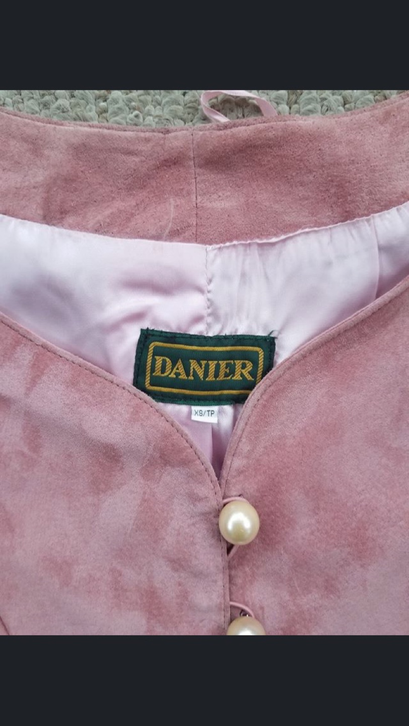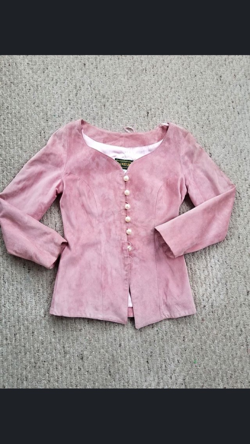 Vintage 80s Danier. Short, fitted jacket with sweetheart neckline and oversized pearl buttons. Bottom button missing. Otherwise good vintage condition.