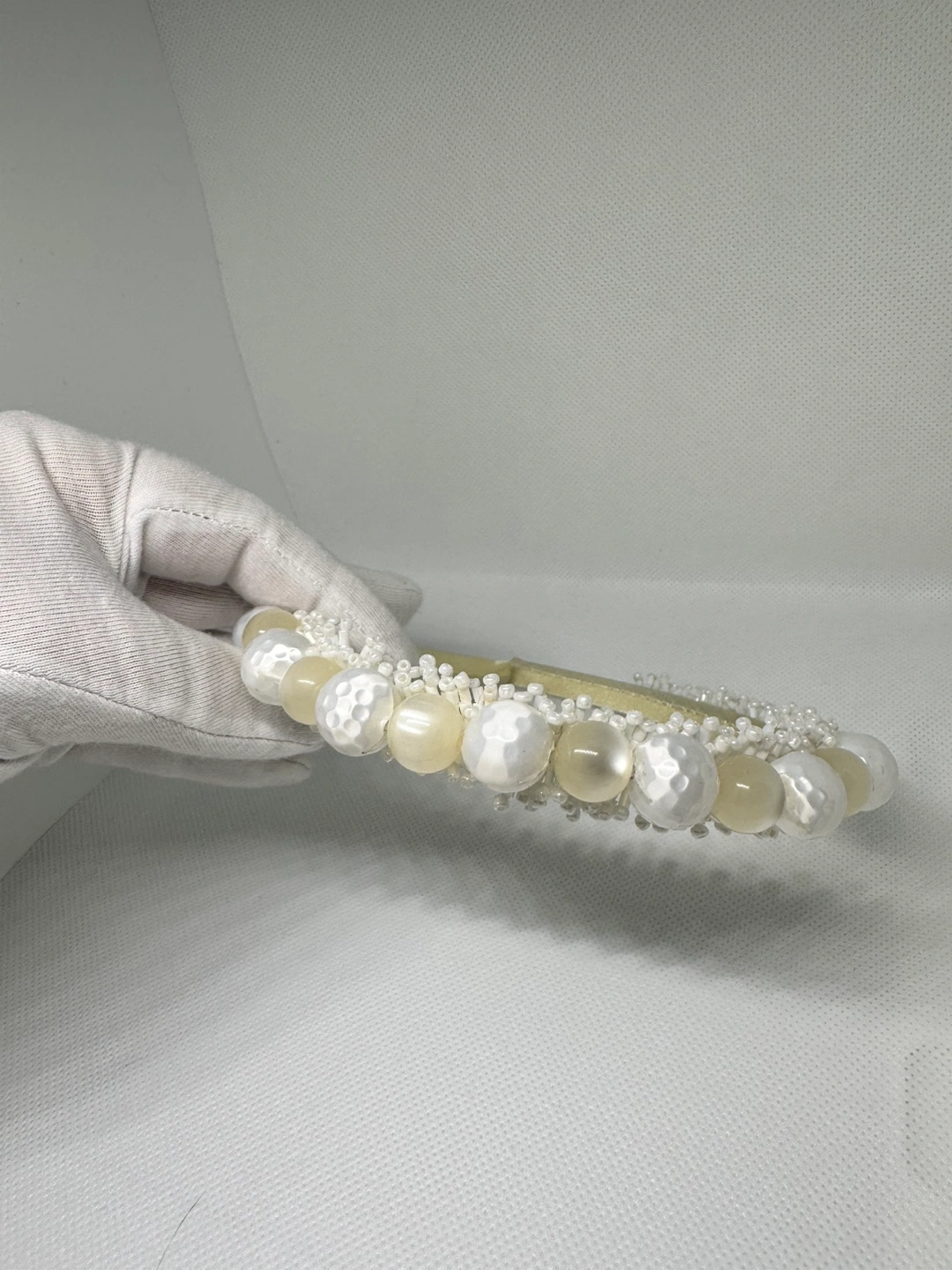 Beautiful headband. Features off-white and cream pearls and beads. Flexible band. Perfect for weddings or special occasions.