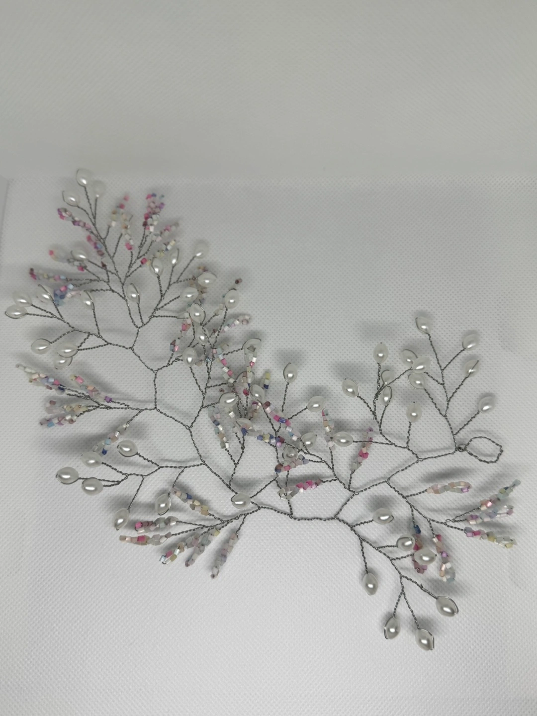 Beautiful hair accessory. Features small pearls and colourful beads. Wire branches create a unique design. Perfect for weddings or special occasions.