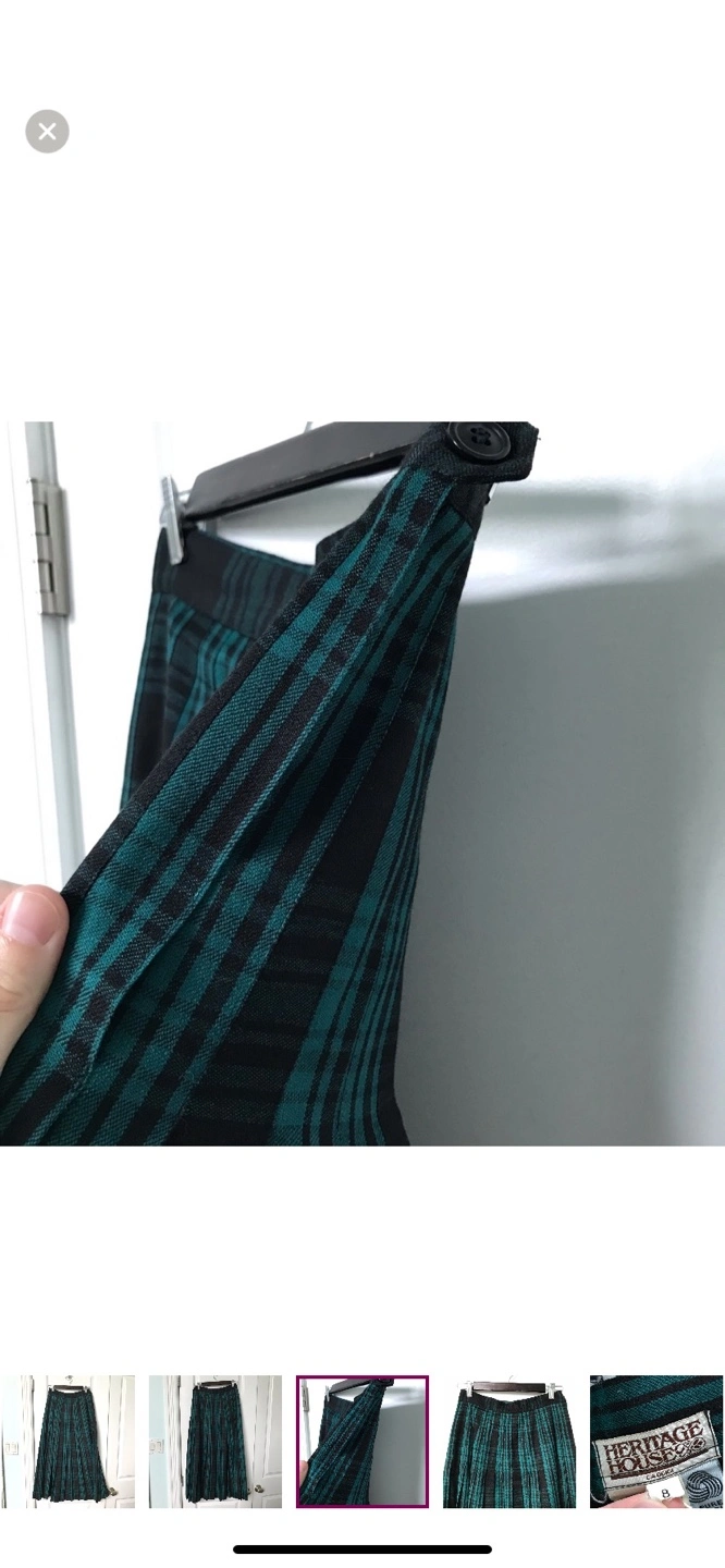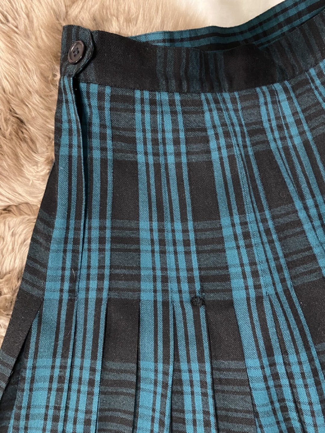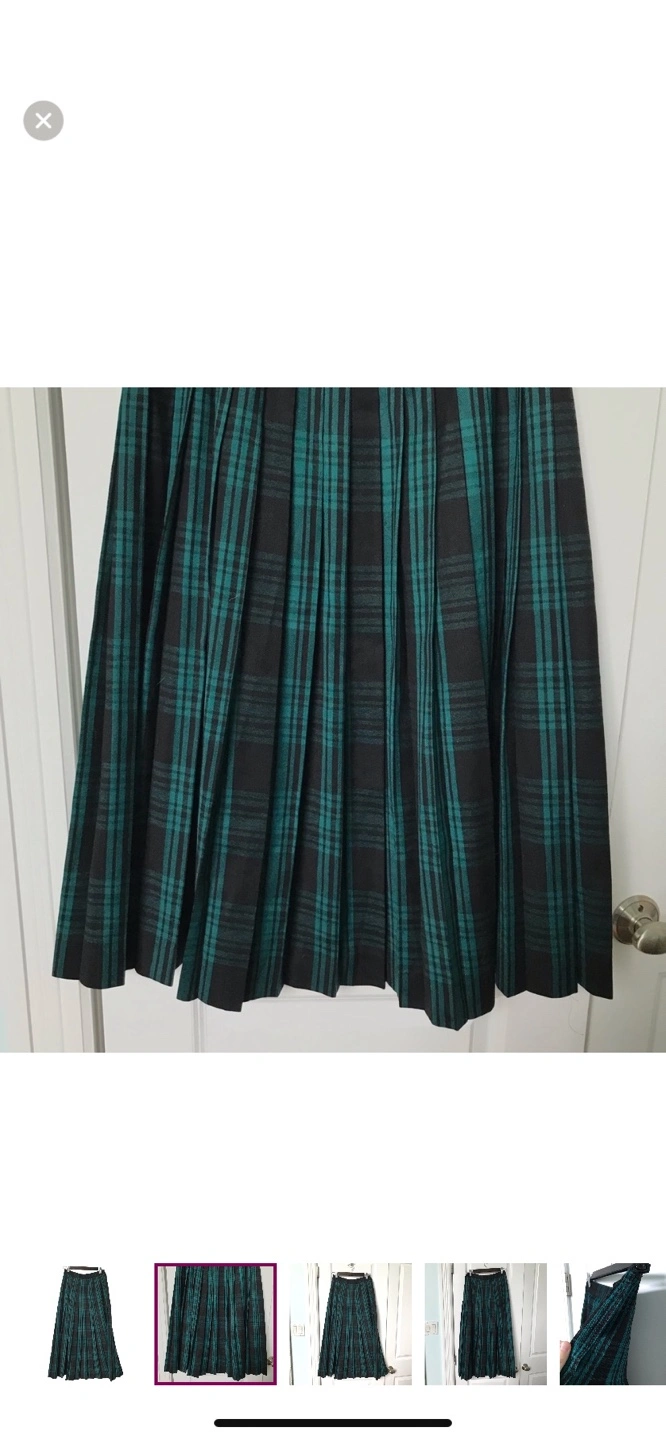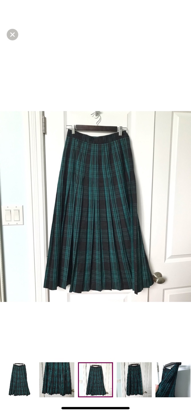 Women's vintage pleated maxi skirt. Teal green and black plaid. Zip and button side closure. 100% pure virgin wool. Made in Canada. Good pre owned condition, a small repair in back, see photos.