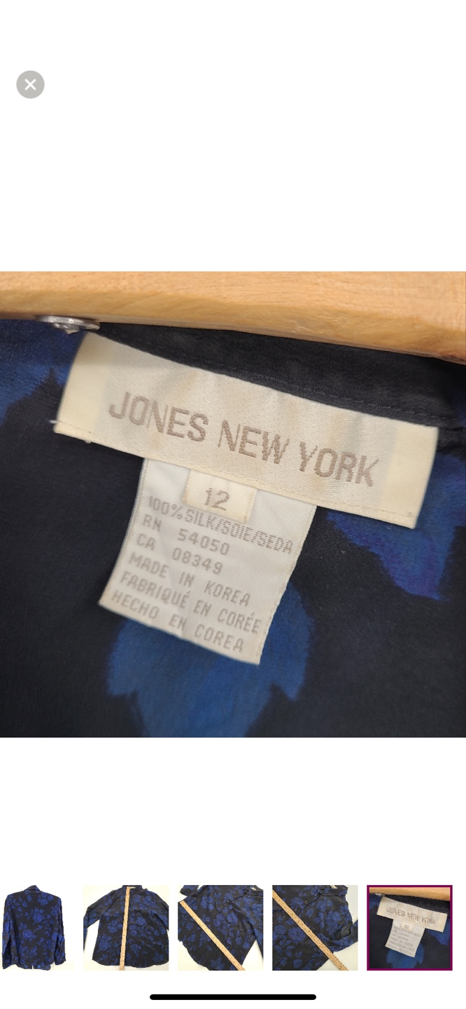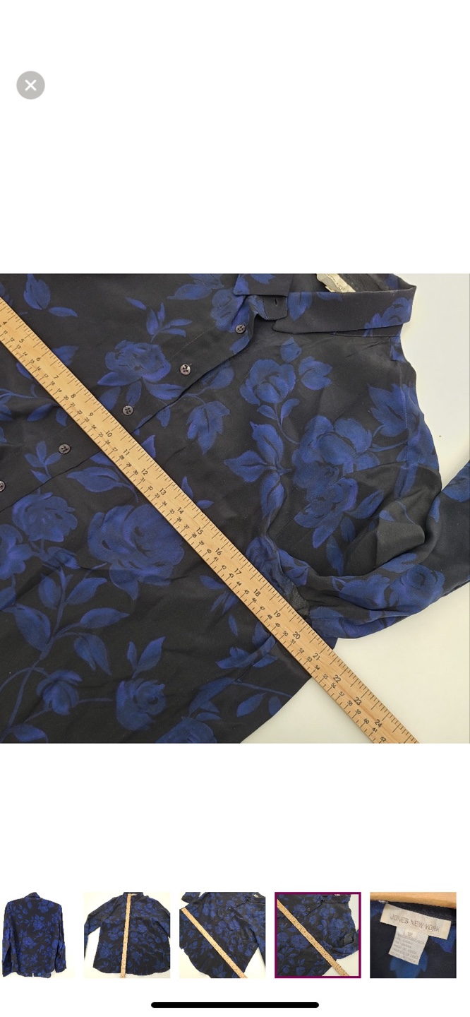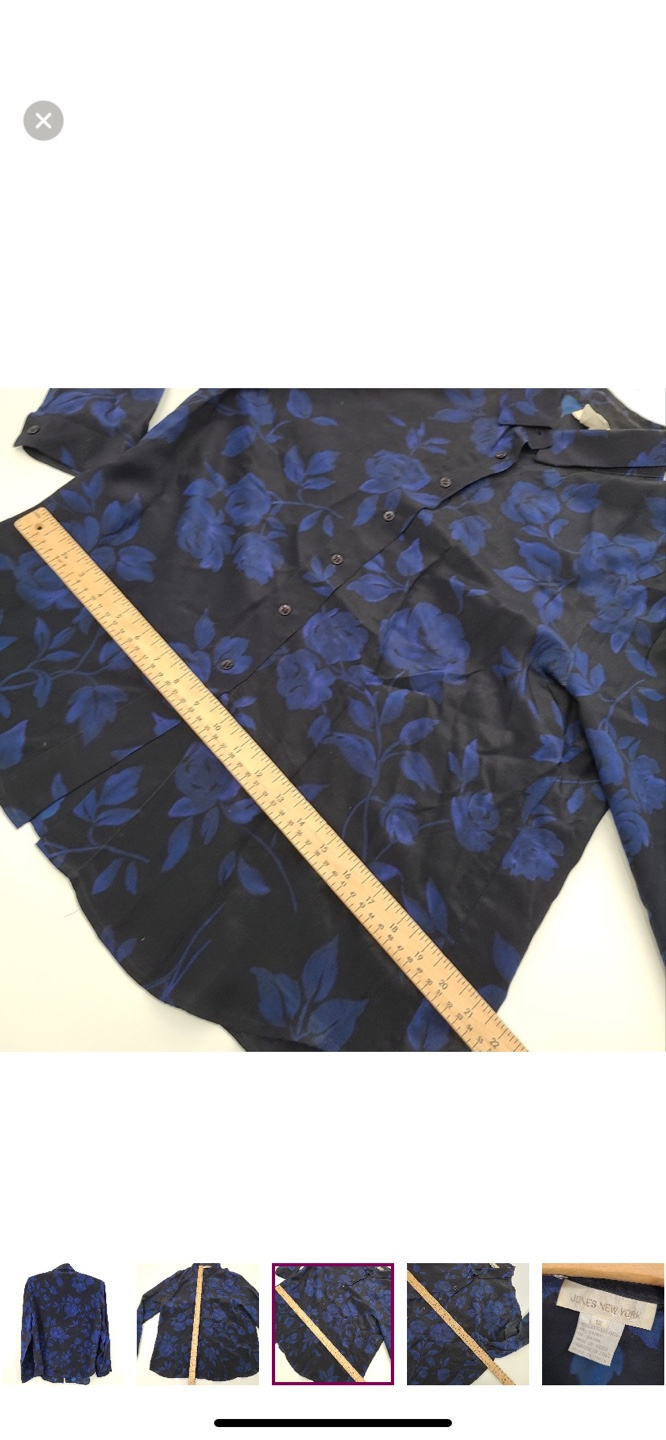 Vintage Jones New York long-sleeved button-down shirt. Blue rose pattern on black background. 100% silk. Marked size 12, best for medium, but please see measurements.
