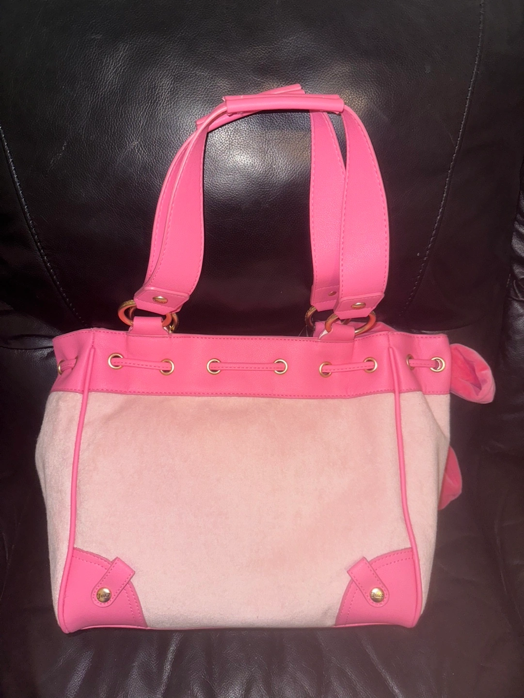 Adorable Juicy Couture handbag. Pink velour material. Features a drawstring closure and pink leather accents. Includes a detachable pink velvet bow. Excellent for everyday use.