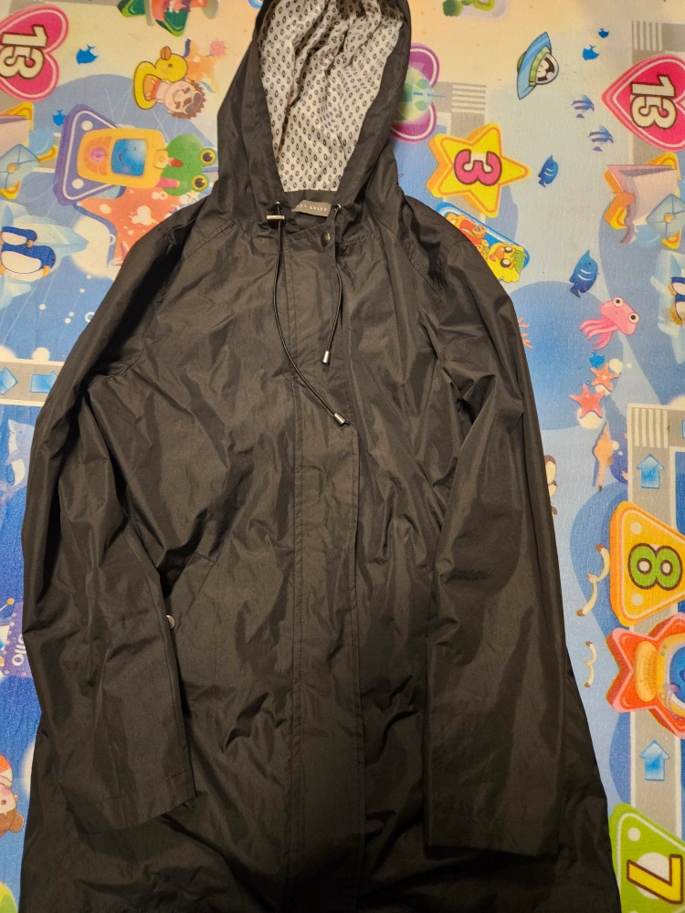 Women's black rain jacket. Features a hood with patterned lining. Long sleeves and a zipper closure. Lightweight and waterproof. it's medium but fits a little bit bigger, worn few times