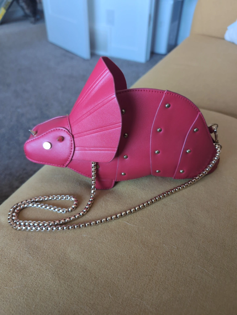 Buy & SellRed Triceratops Shaped Crossbody BagRed Triceratops Shaped Crossbody Bag$30Unique red leather crossbody bag. Triceratops design. Gold chain strap. Studded accents.ConditionLike newWHERE TO MEETJensen LakesView MapSELLERElleAldergrove181 review0 chats·1 favorites·8 views