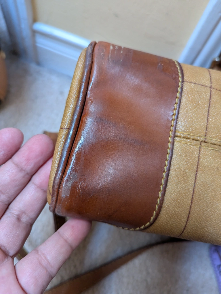 Pre-owned shoulder bag. Features a world map design, brown leather accents, and adjustable strap. Small interior zip pocket. Excellent for everyday use.