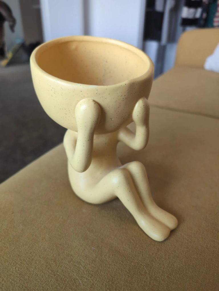 Adorable pale yellow ceramic planter. Shaped like a little person sitting with its hands over its eyes. Small specks throughout the planter.