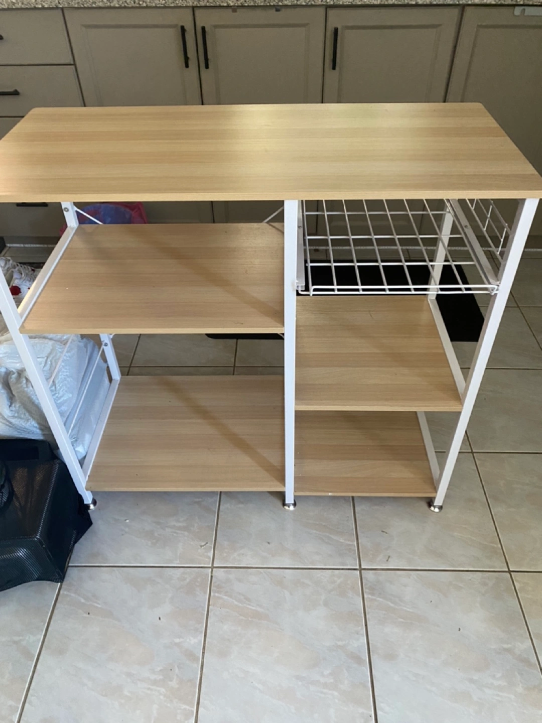 Three-tiered shelving unit. White frame. Light wood shelves. Includes wire rack. Great for kitchen organization.