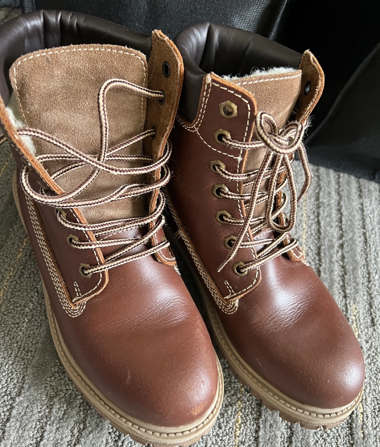 Women's brown boots. Lace-up closure. Warm, fuzzy interior lining. Excellent for colder weather. Size 38.