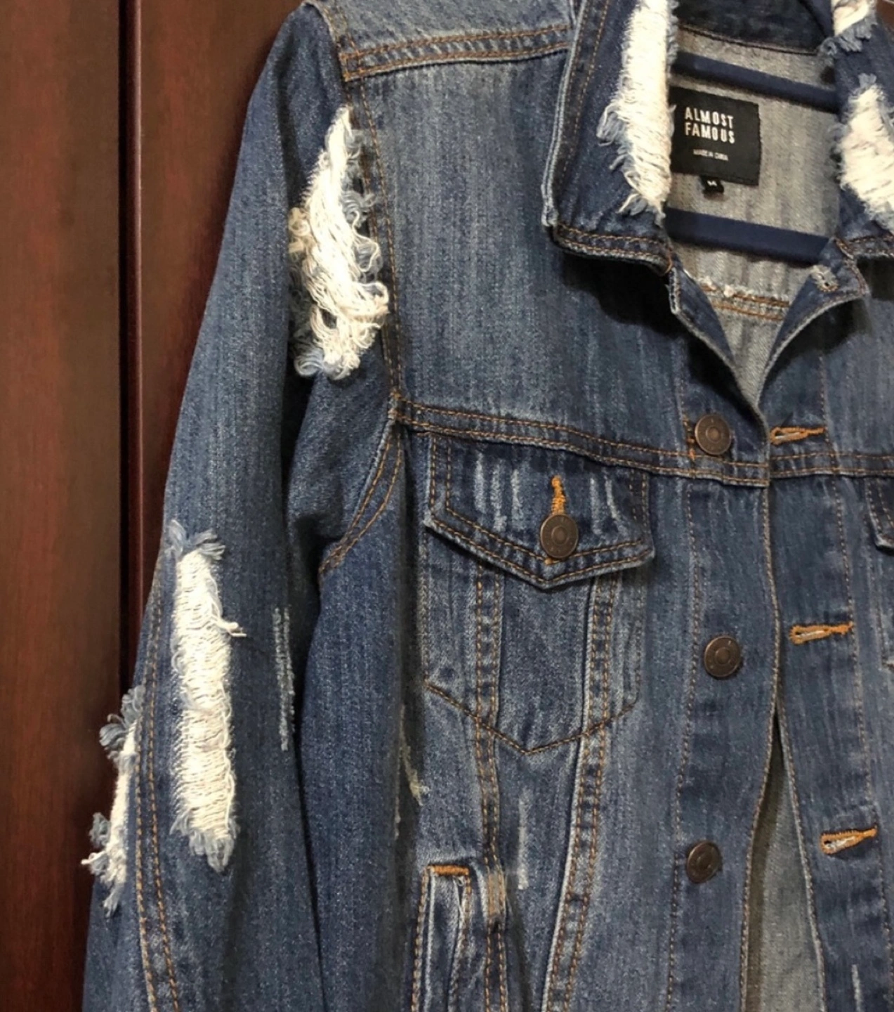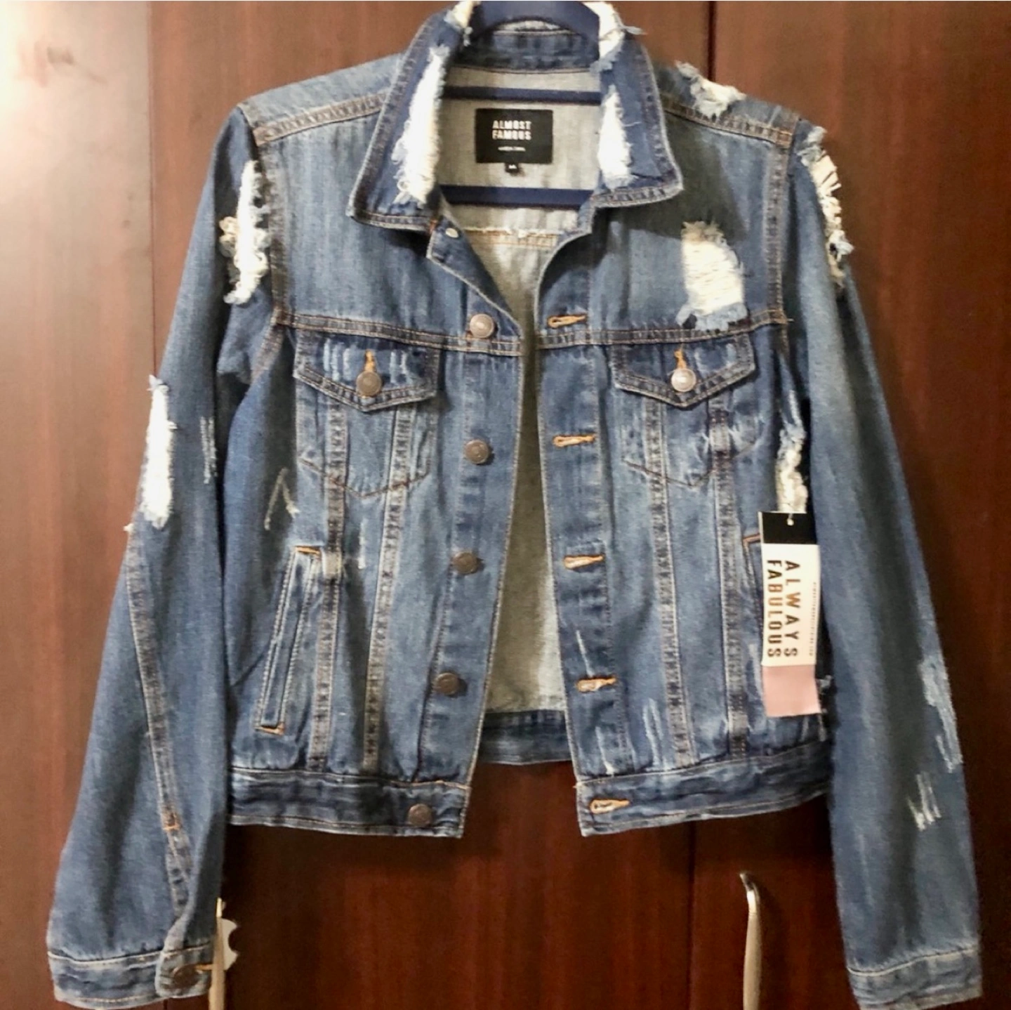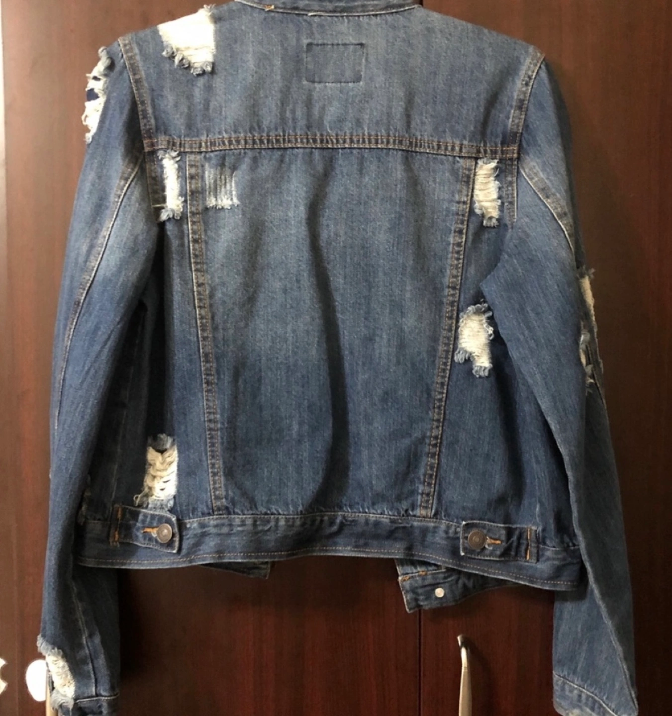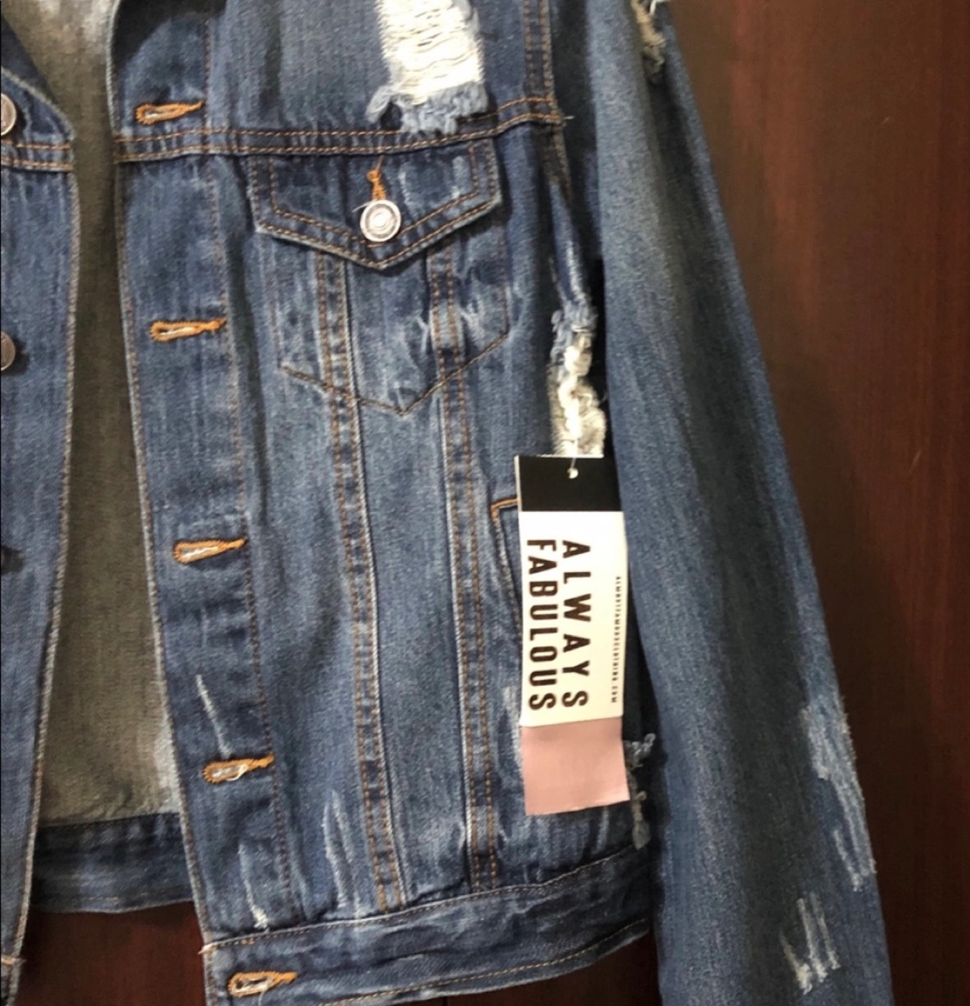 New with tag Women's distressed denim jacket. Multiple rips and tears. Classic style. Long sleeves.