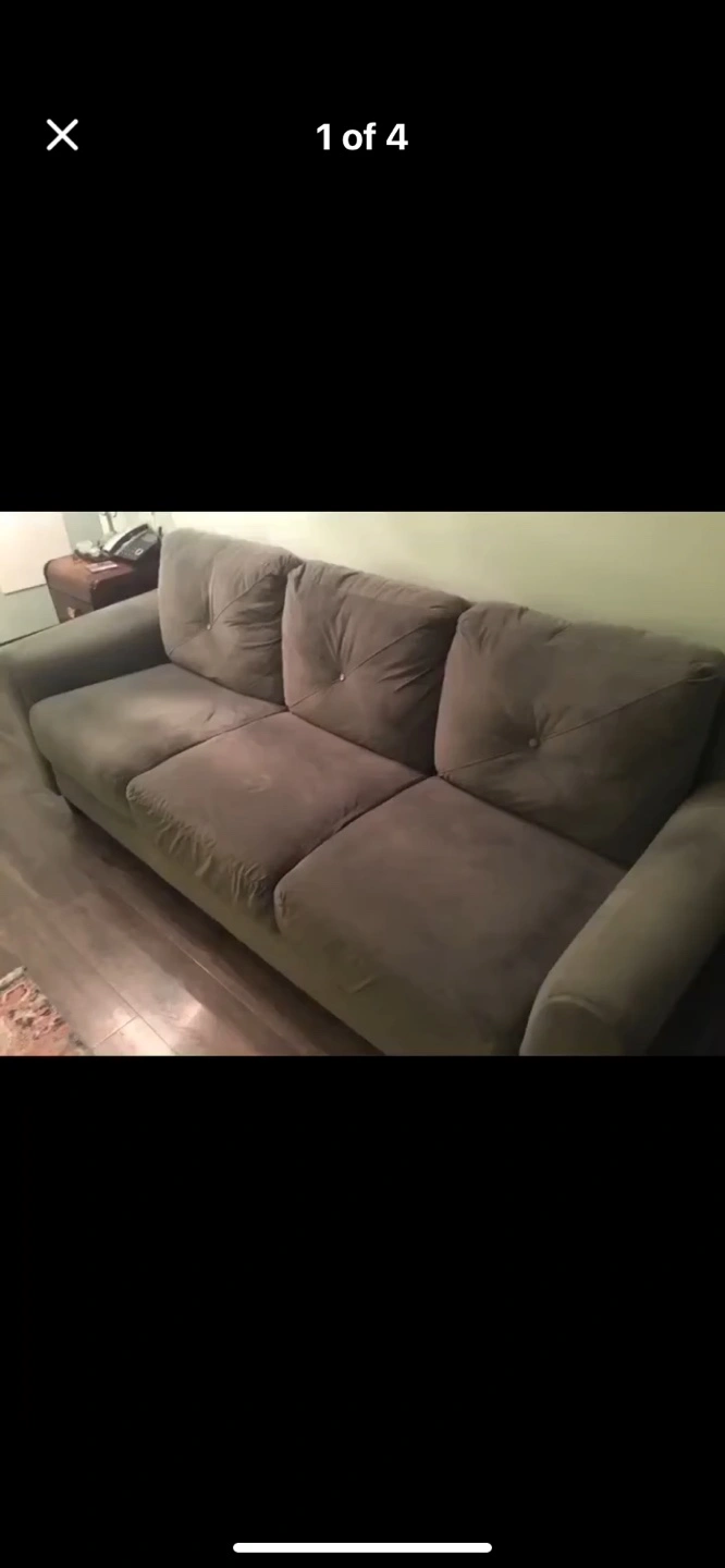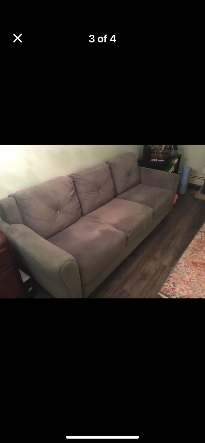 Three-seater sofa, grey fabric upholstery. Button tufting on cushions. Good condition. There are two buttons missing but otherwise is in good shape. No stains, odours etc. from nonsmoking home. Very clean with some animal hair from my cat but I’ll do my best to remove it. Cannot deliver. Pickup near Westbrook Mall SW. the sofa comes apart, is easily assembled and lightweight, easy to move. Perfect for apartment size room.