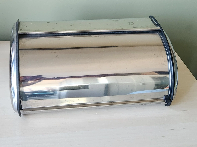 Silver-toned breadbox. Sliding lid. Features a stainless steel body and black accents. Shows minor signs of wear.