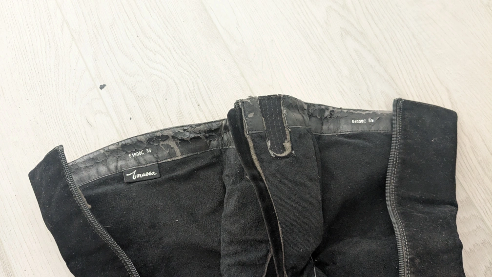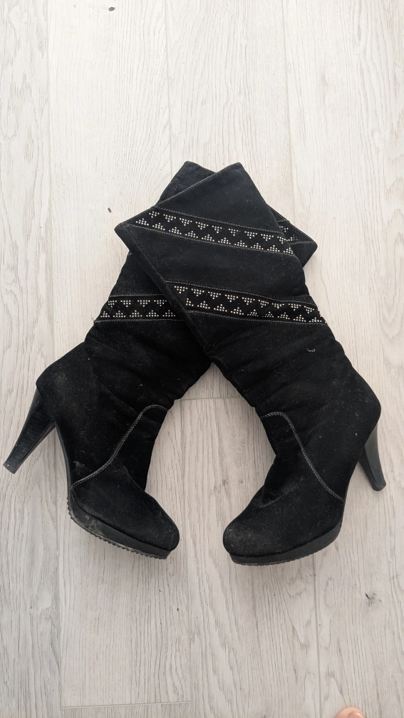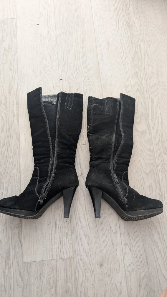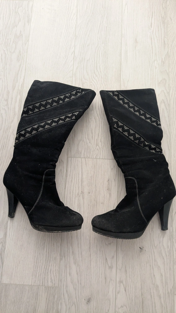 Pair of black suede women's knee-high boots. Features a decorative stitched pattern and stiletto heel. Side zippers for easy on and off. Some wear and tear visible.