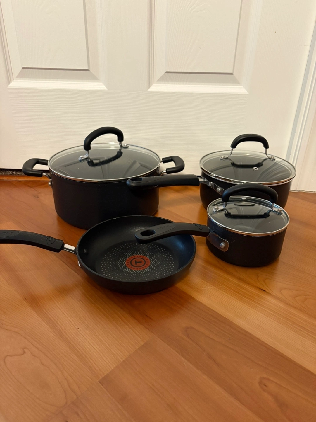 Black five-piece cookware set. Includes one large pot with lid, one small pot with lid, one medium pot with lid, and a small frying pan. Non-stick surface.