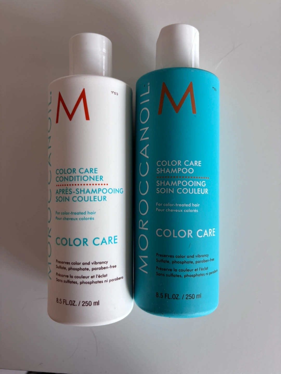 Moroccanoil Color Care shampoo & conditioner. 250 ml each. For color-treated hair. Preserves color and vibrancy. Sulfate, phosphate, and paraben-free. Each retail for $38 plus tax. I am asking for $40 for both!