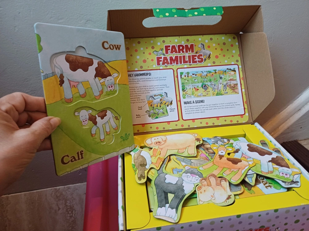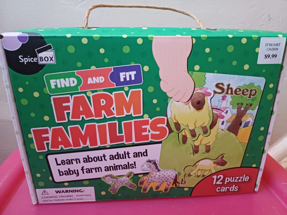 12 piece jumbo puzzle. Learn about adult and baby farm animals. Sturdy puzzle pieces. Great for learning and play. Ages 3 and up.