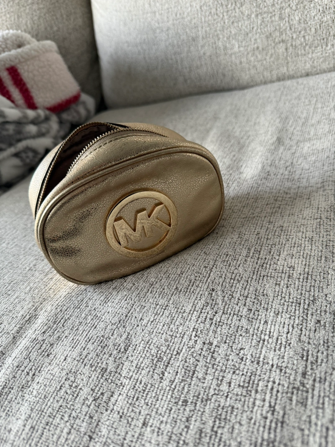 Small gold cosmetic bag. Zipper closure. MK logo on front. Perfect for travel.