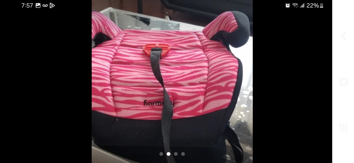 Pink zebra print booster car seat. Suitable for children approximately 4-12 years old, who weigh between 40-100 pounds. Features a comfortable design. Pre-owned, shows some wear.