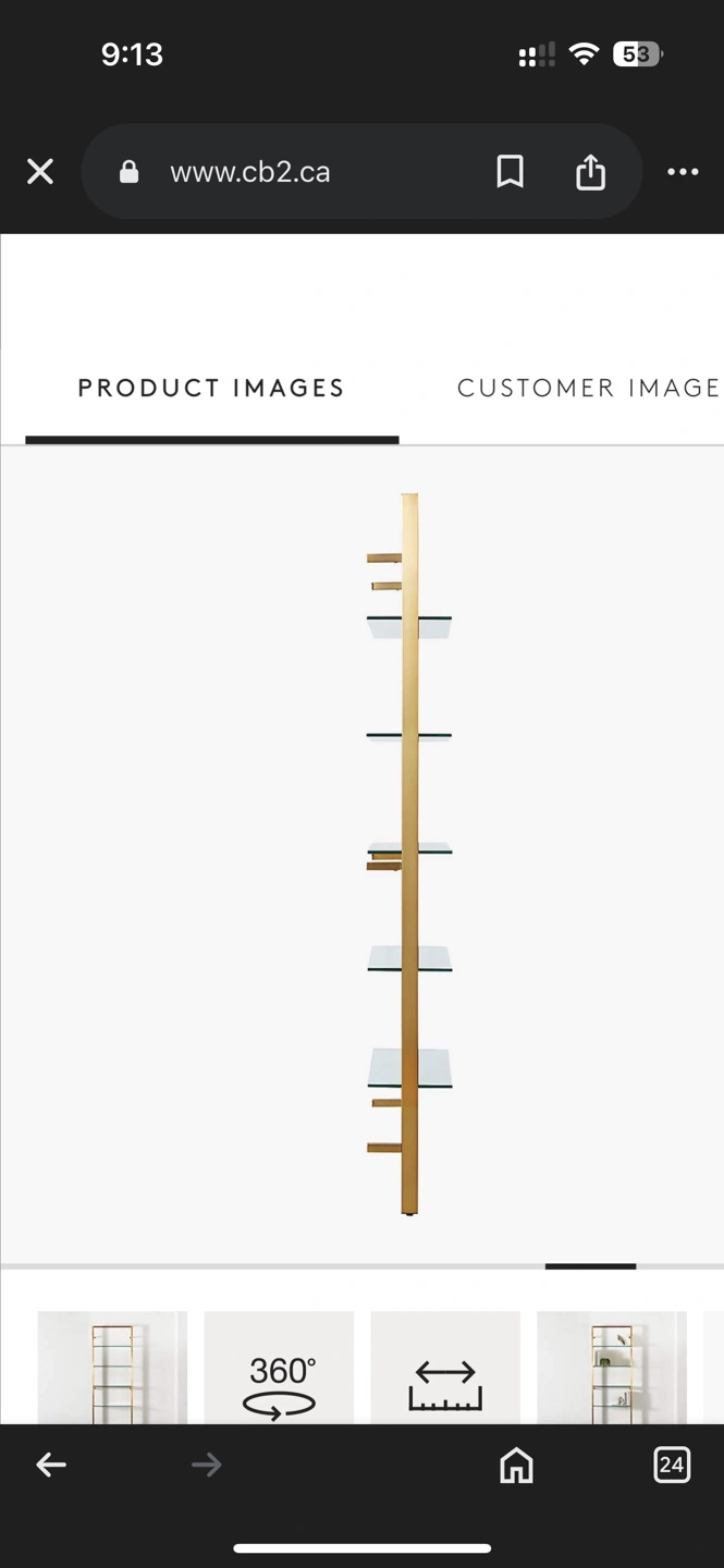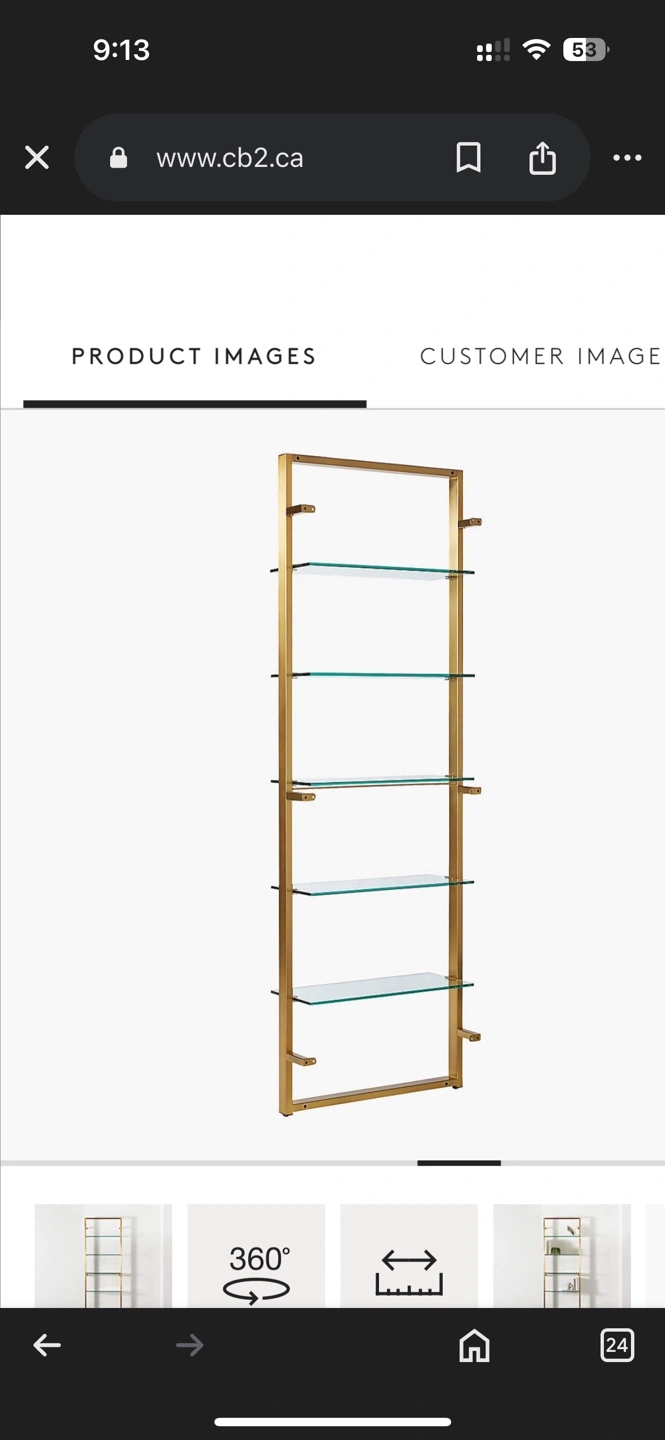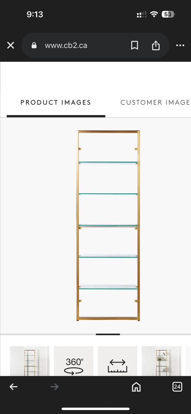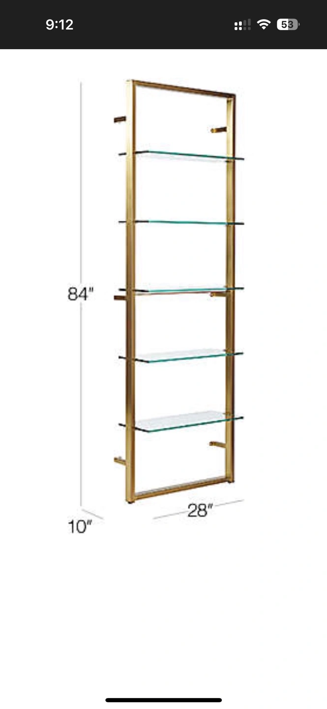Pair of CB2 bookshelves. Gold metal frame, glass shelves. Excellent for displaying décor or books. Minimalist design.