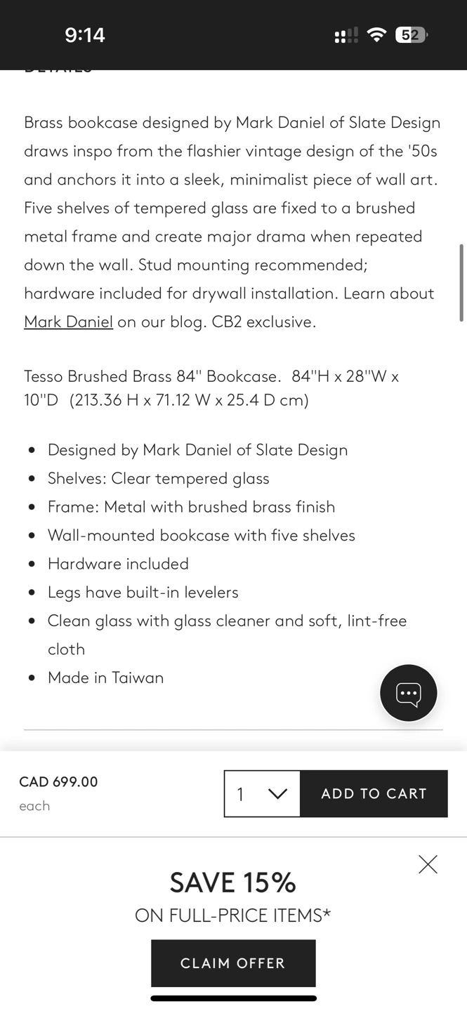 Brass bookcase designed by Mark Daniel of Slate Design draws inspo from the flashier vintage design of the '50s and anchors it into a sleek, minimalist piece of wall art. Five shelves of tempered glass are fixed to a brushed metal frame and create major drama when repeated down the wall. CB2 exclusive.