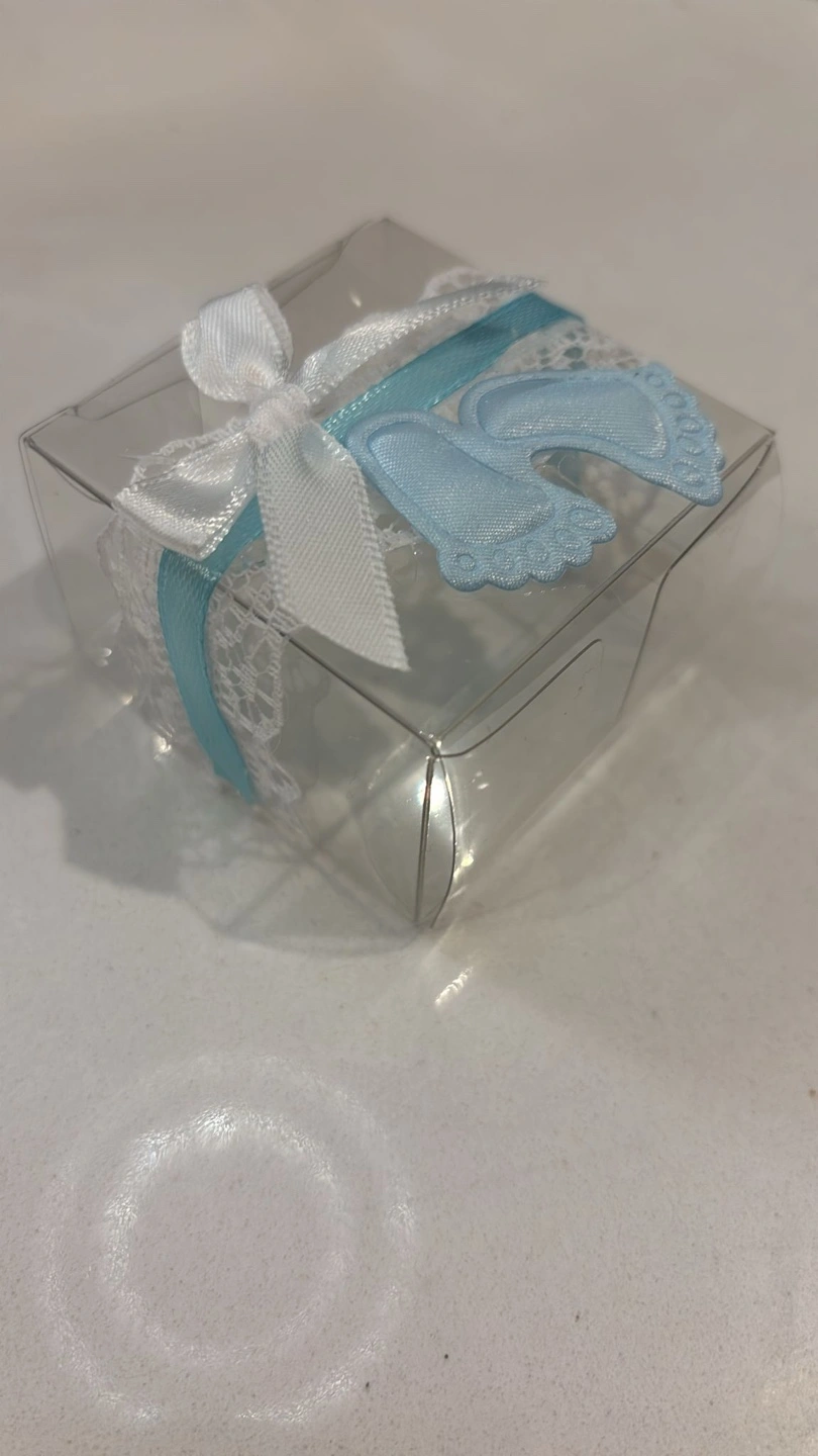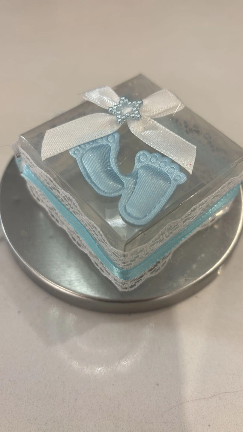 Clear plastic boxes, perfect for party favors. Decorated with light blue baby footprints, white ribbon, and lace. Ideal for a baby shower or gender reveal. Available also in pink