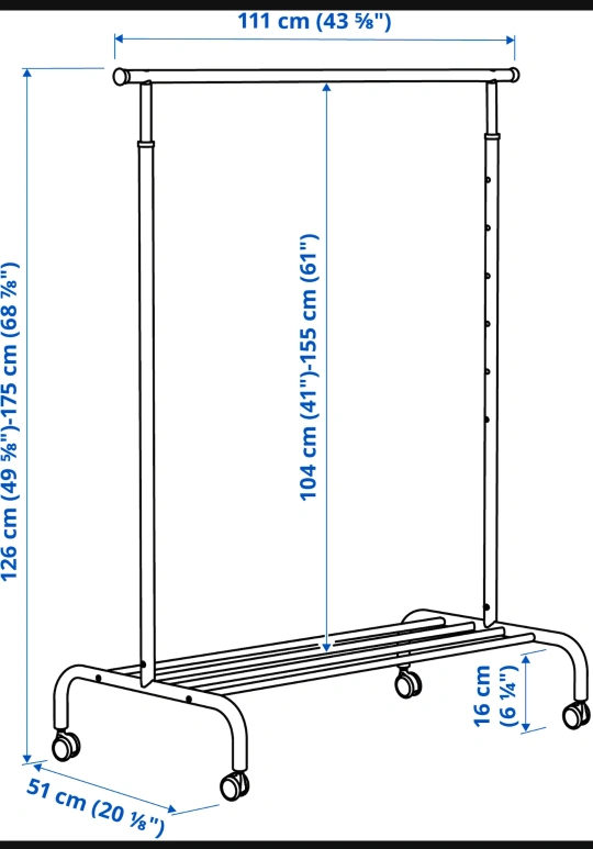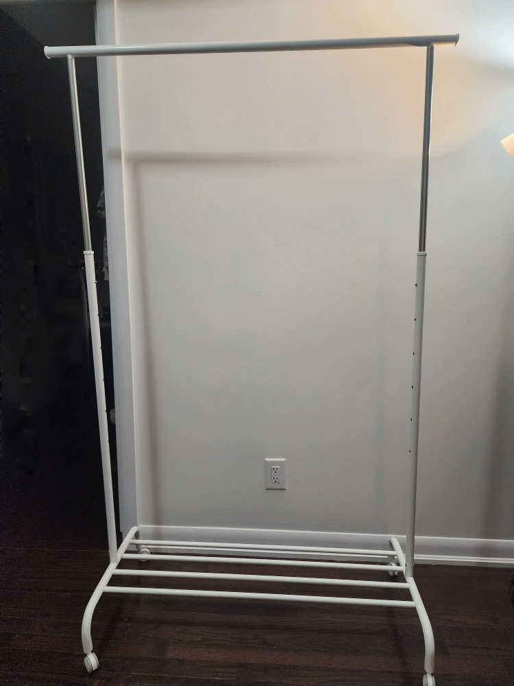 Adjustable height. White metal frame. Four wheels. Lower shelf for shoes or folded clothes. Great for small spaces.