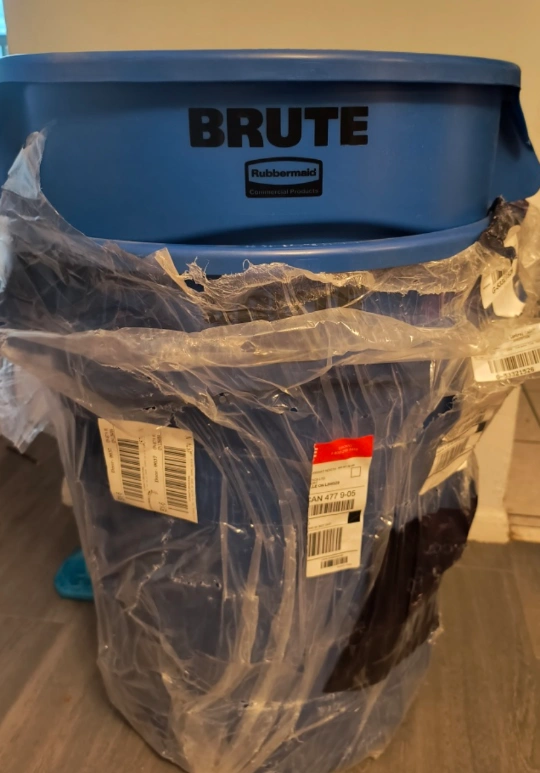 Brand New Large blue plastic trash can. 32-gallon capacity. New in packaging.