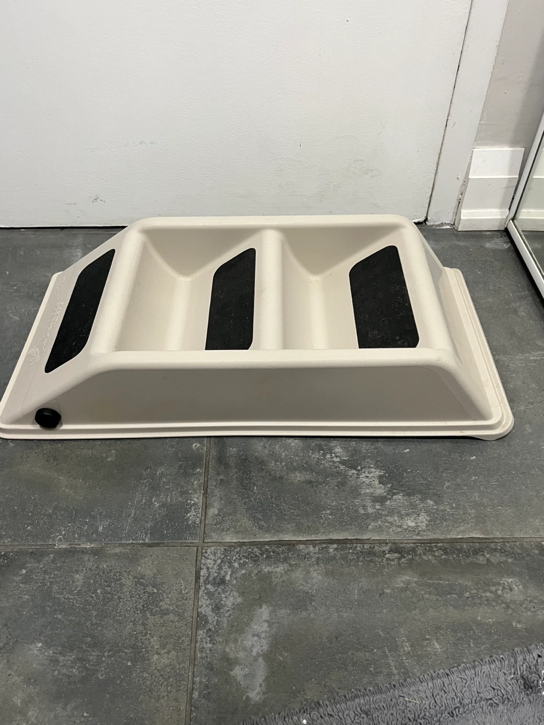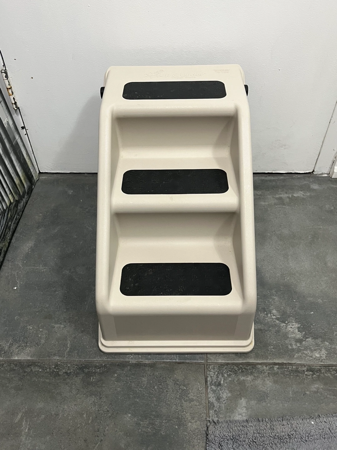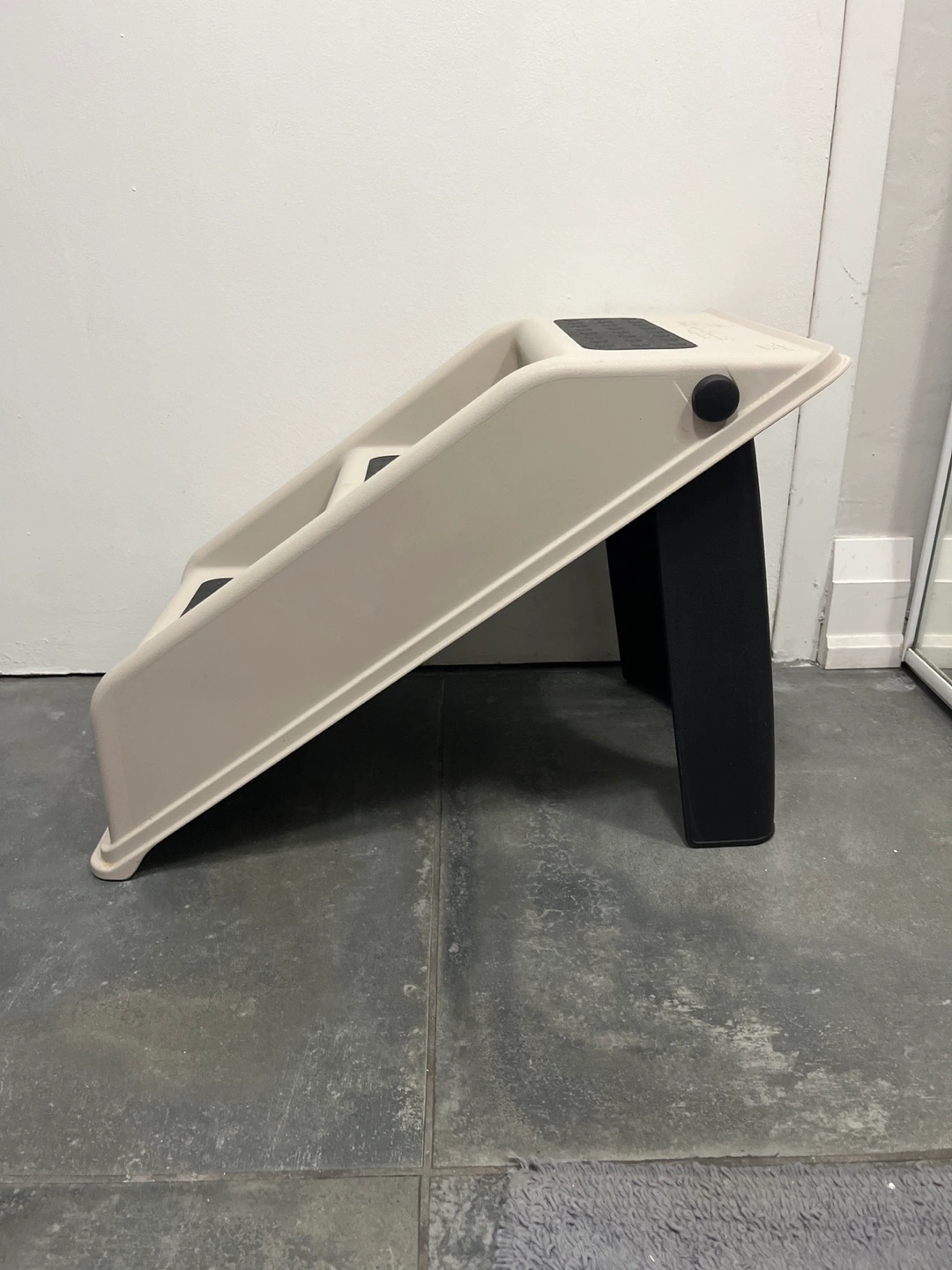Beige and black pet steps. Three steps. Easy for small dogs and cats to access higher surfaces. Durable plastic construction. Compact design. Excellent condition. Folds easily for storage
