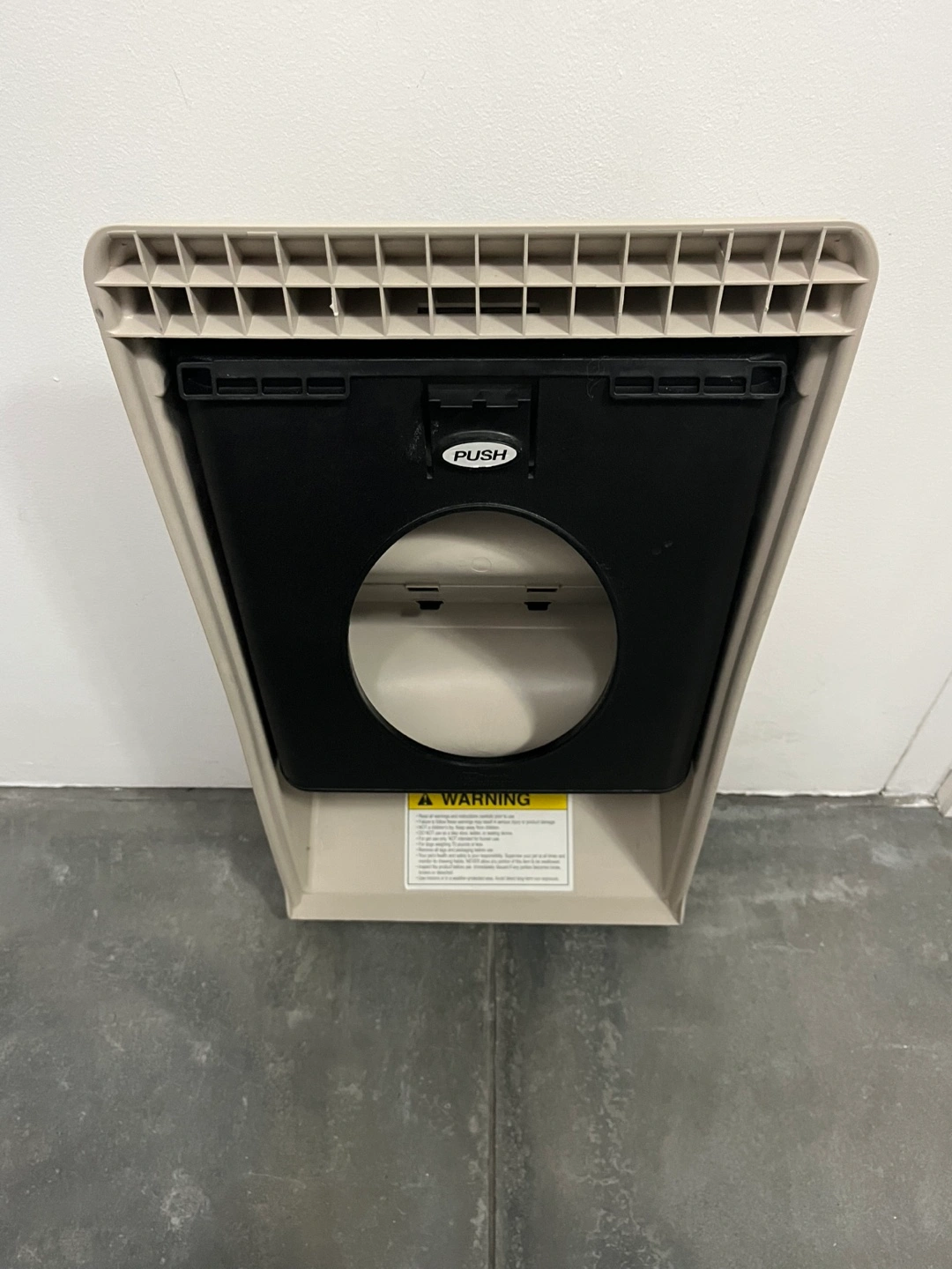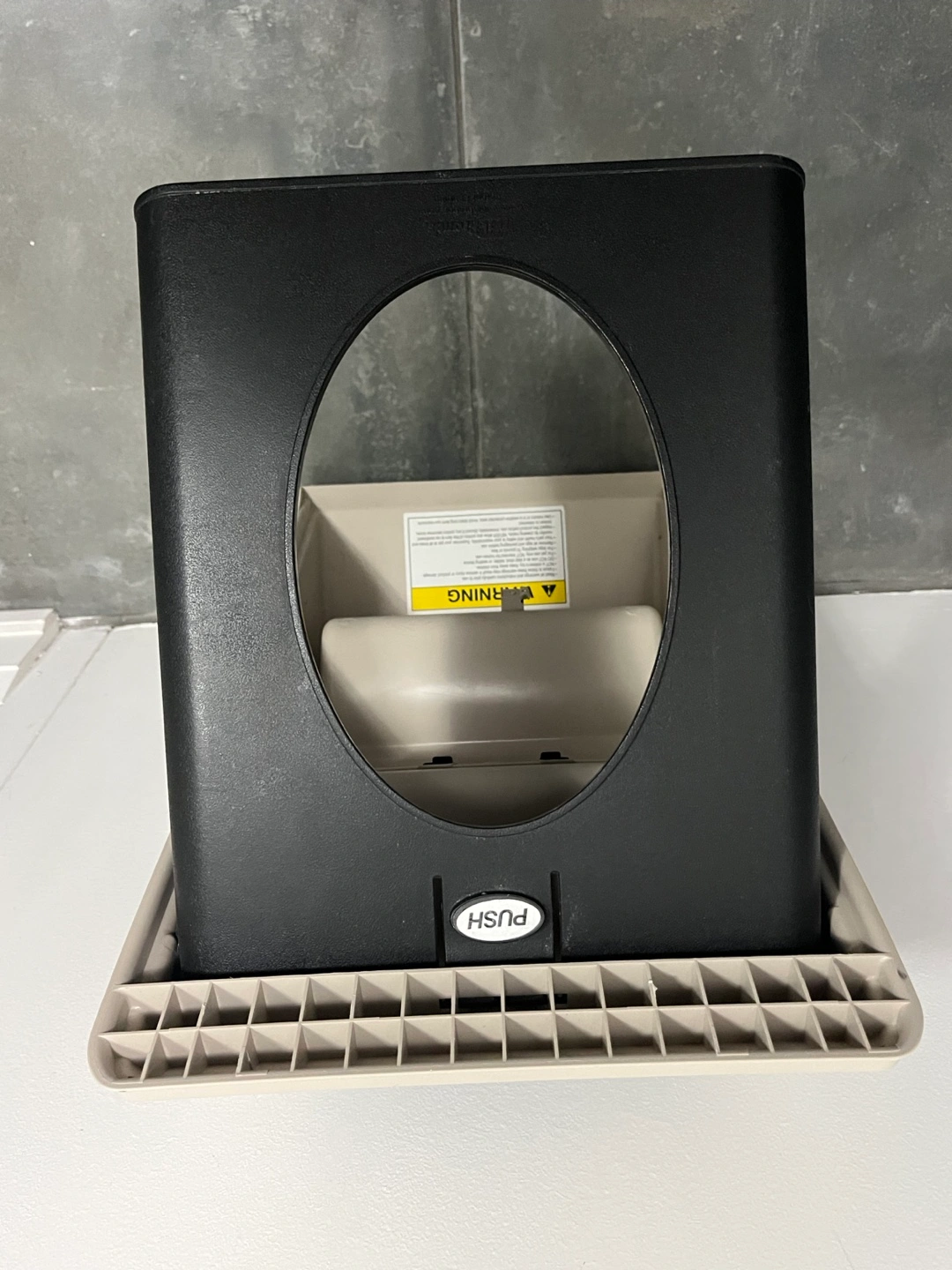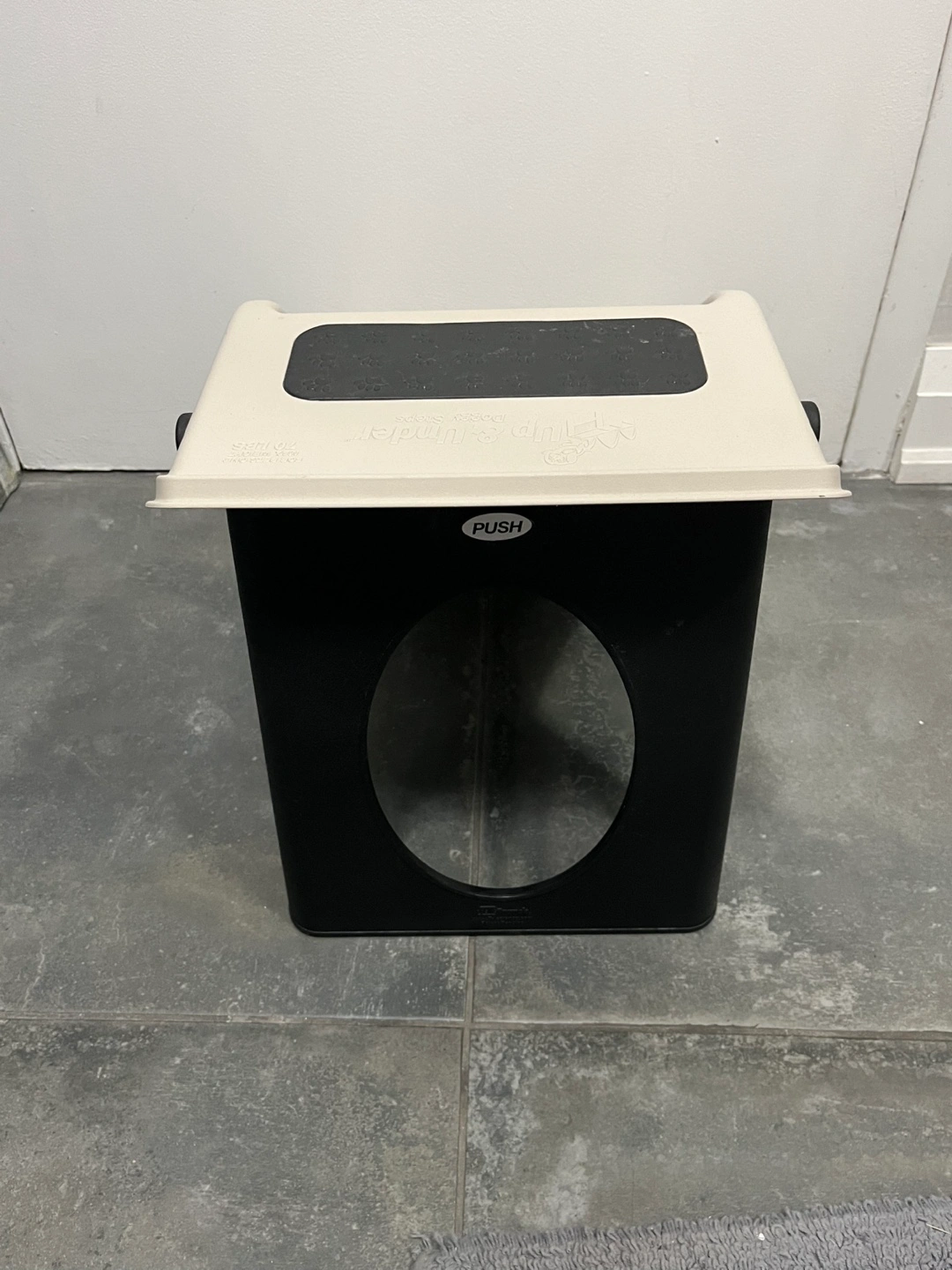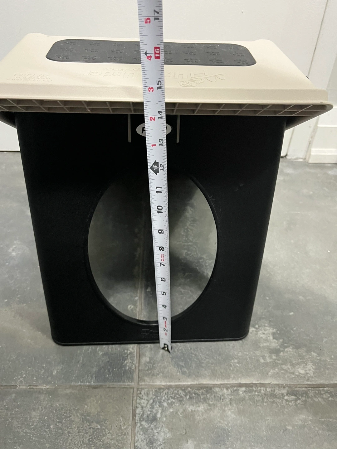 Beige and black pet steps. Three steps. Easy for small dogs and cats to access higher surfaces. Durable plastic construction. Compact design. Excellent condition. Folds easily for storage