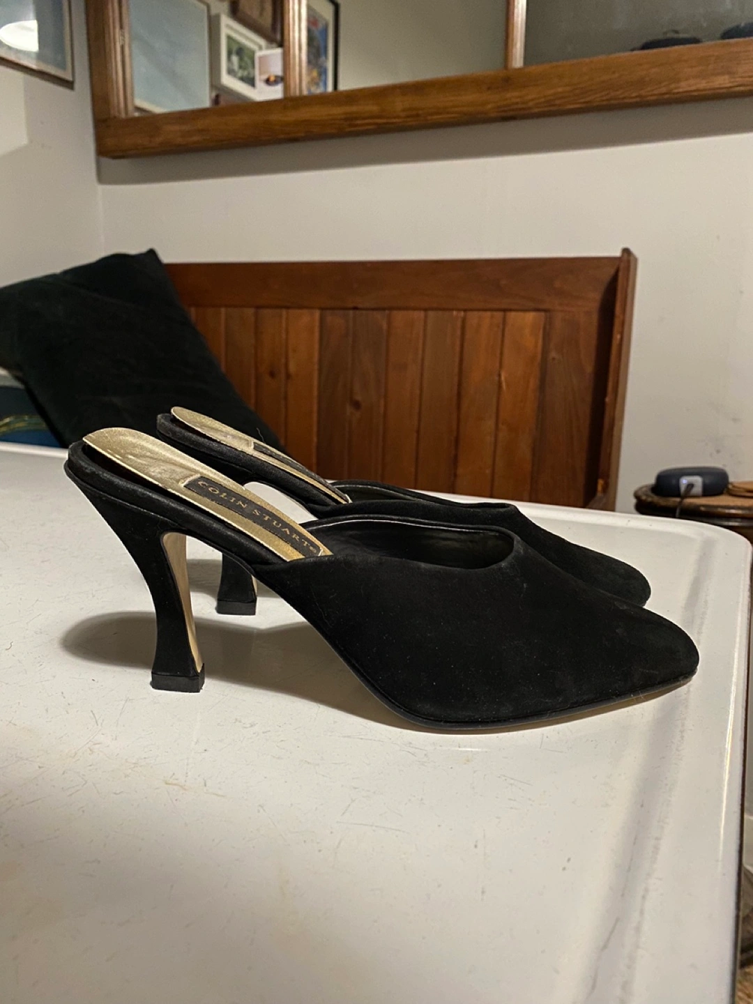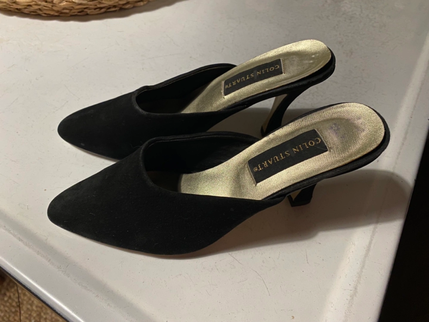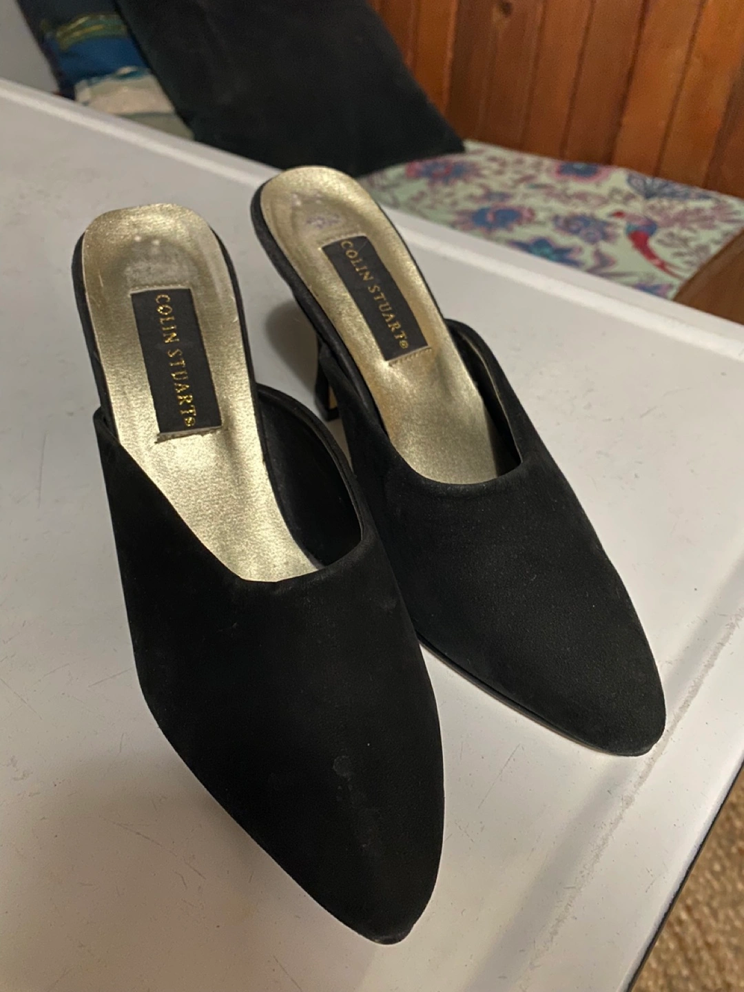 Pair of vintage Colin Stuart black suede mules. Pointed toe and 3.5” flared heel. Great pre-worn condition. Made in Canada.