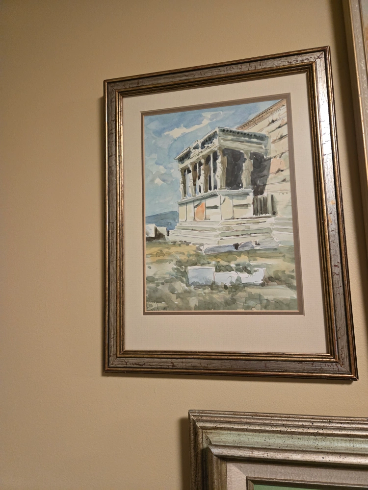 Watercolor painting in a frame, under glass.