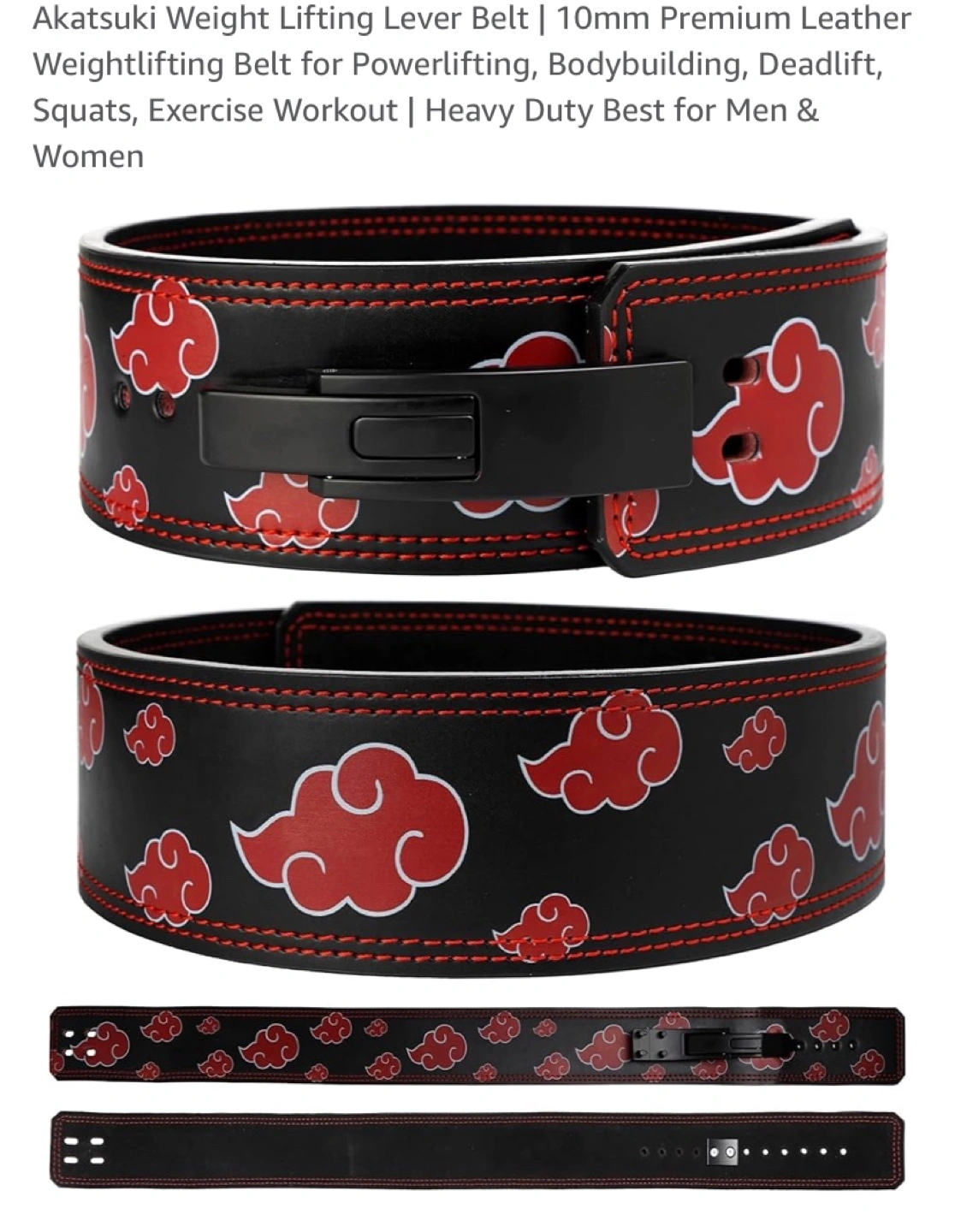 10mm Premium Leather Weightlifting Belt. Suitable for powerlifting, bodybuilding, deadlifts, squats, and exercise workouts. Heavy duty design. Features a unique Akatsuki cloud print.