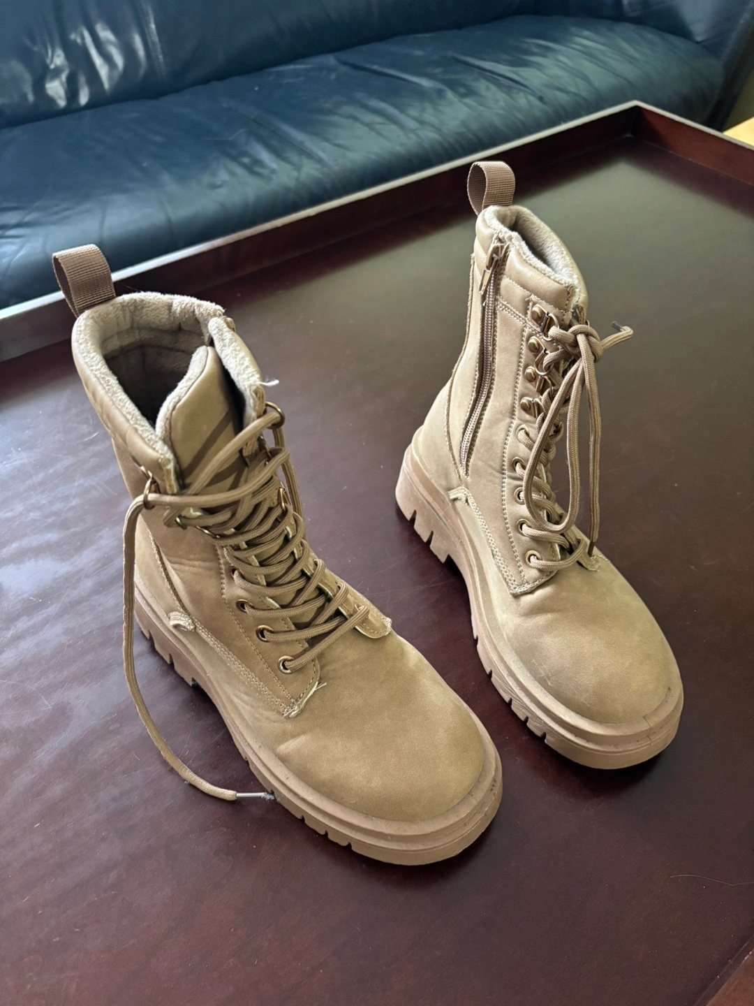 Beige suede-like combat boots. Lace-up closure with side zipper. Chunky platform sole. Warm, fuzzy lining. Good for fall and winter.