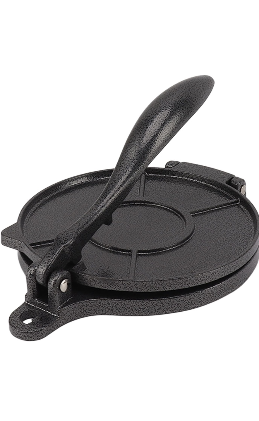 Heavy-duty cast iron tortilla press. Great for making tortillas and other flatbreads. Features a comfortable handle and durable construction. Easy to clean.