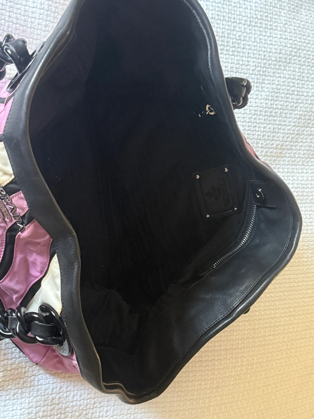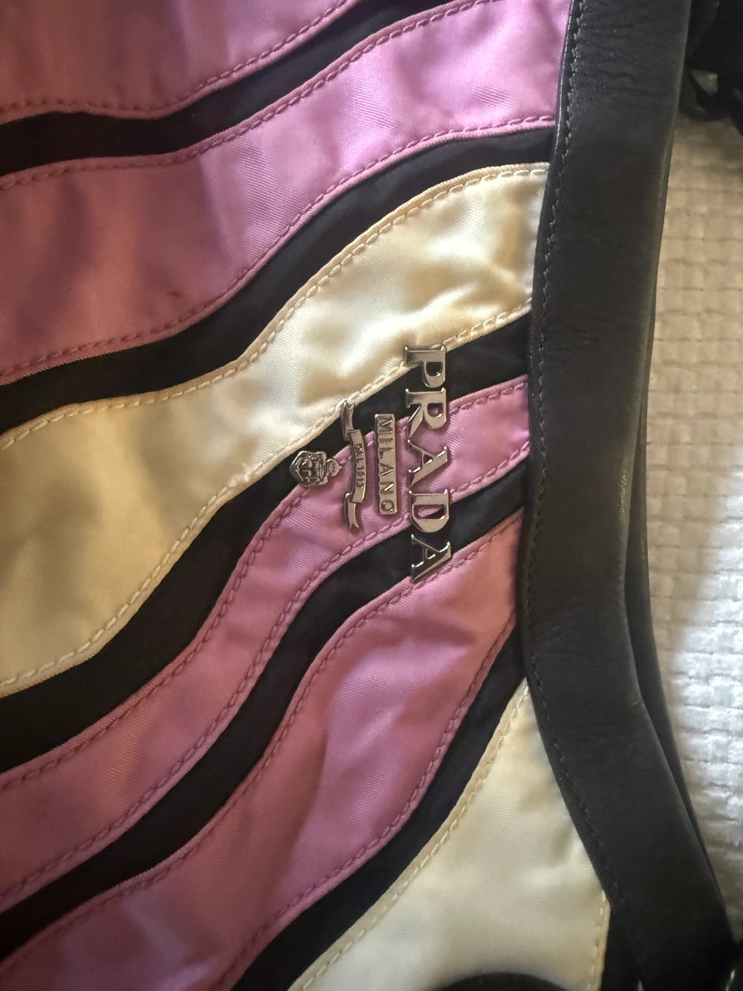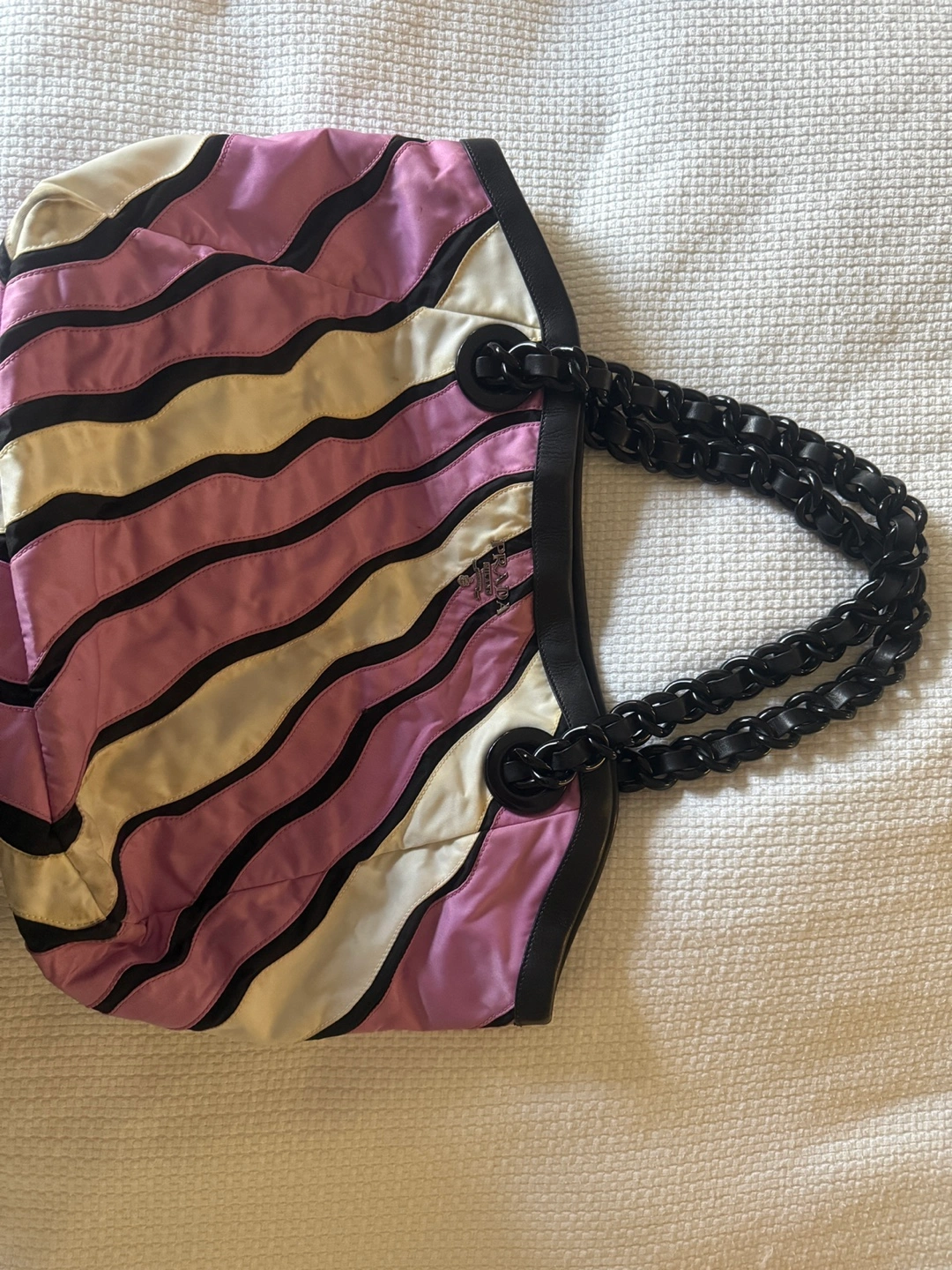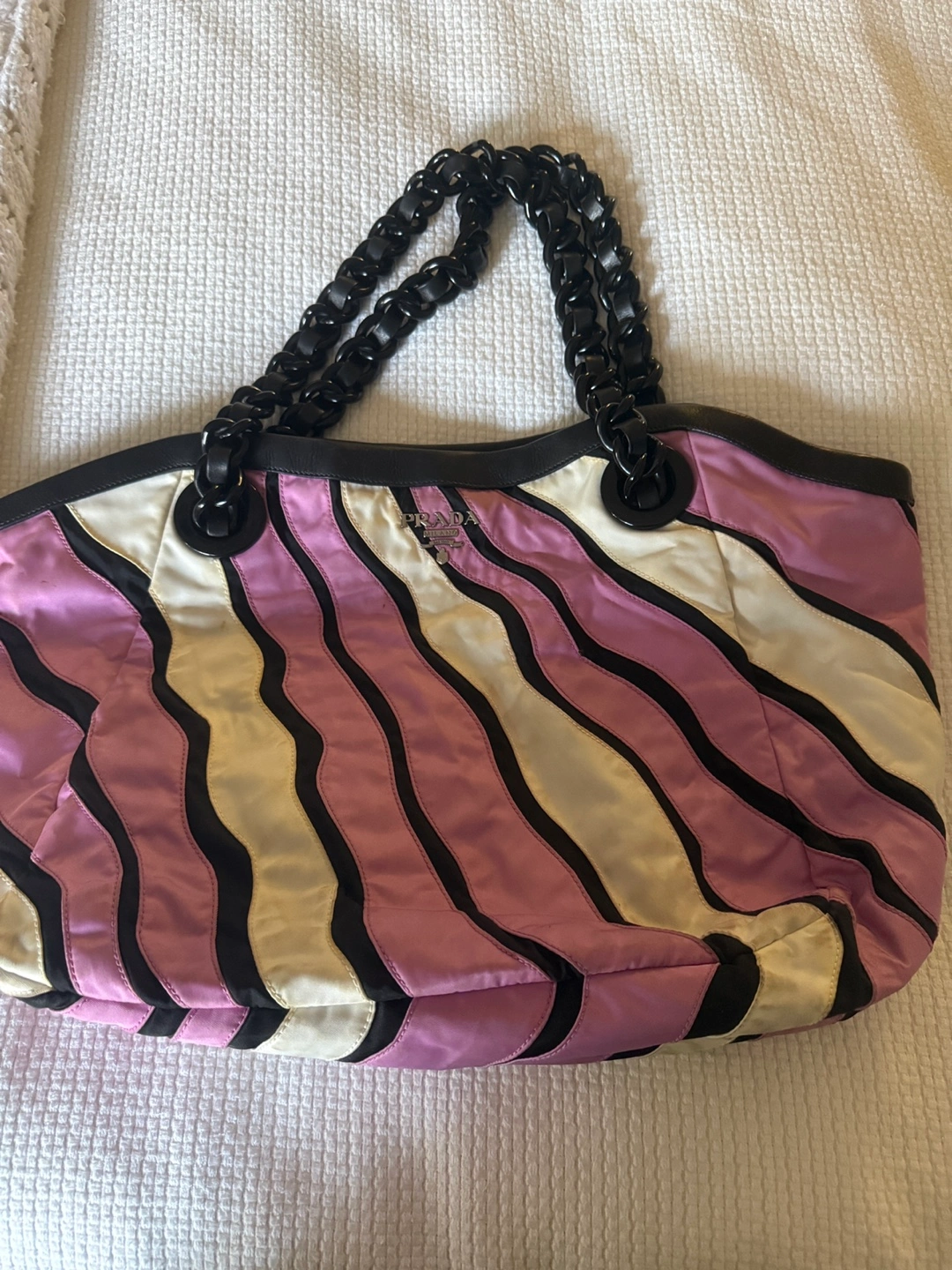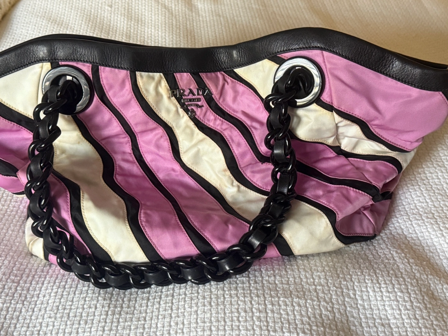 Pre-owned Prada tote bag. Features a purple, white and black striped design. Black chain-link handles. Interior is black fabric. Zipper closure.