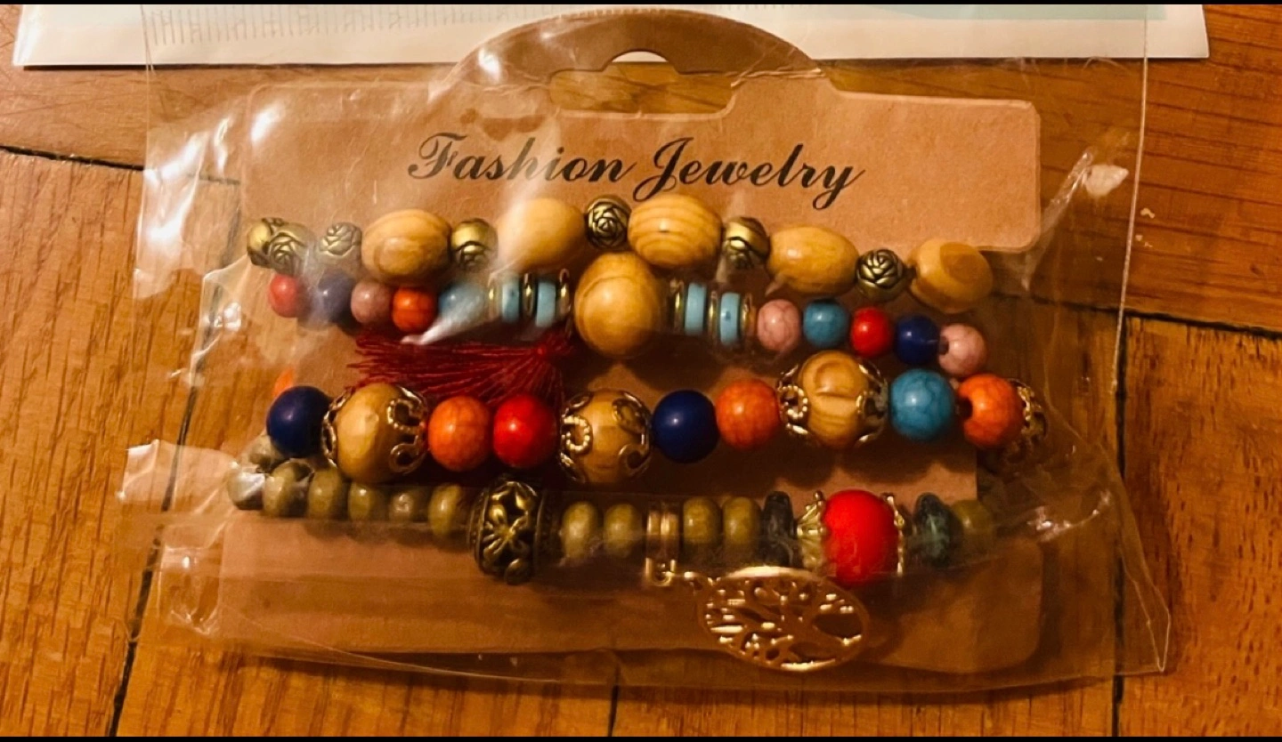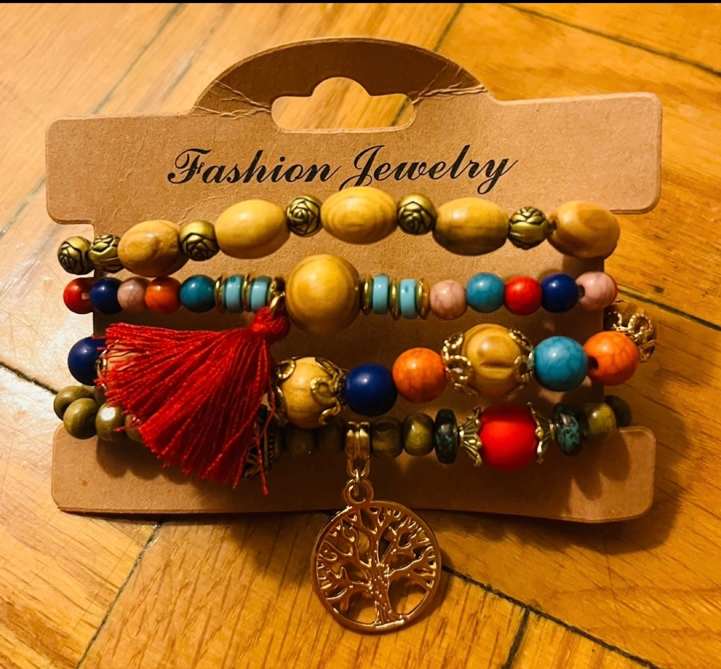 80Four-piece beaded bracelet set. Features wooden and coloured beads, red tassel accent, and gold tree of life charm. Perfect for gifting or personal use. The bracelet is new. I give it with a gift bag as seen in the picture.