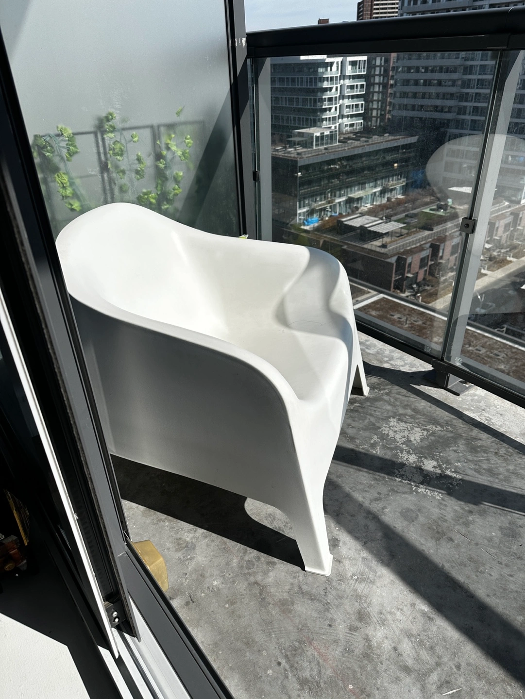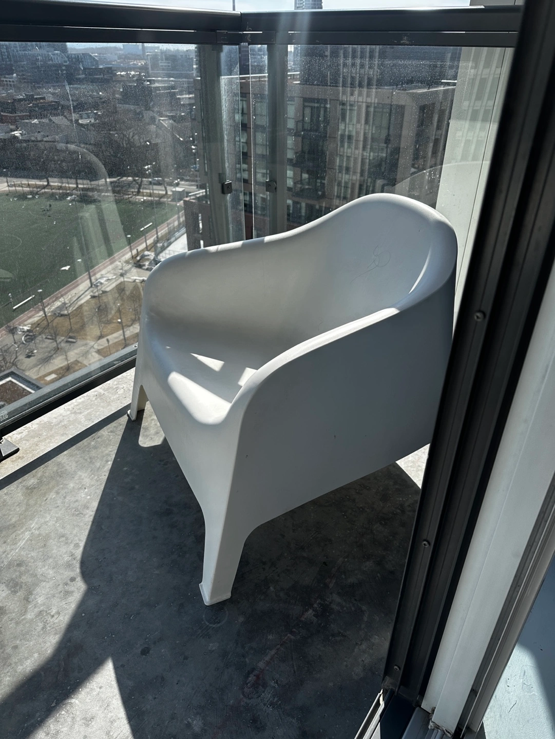 Comfortable plastic chair, perfect for a balcony or patio. Lightweight and easy to move. Both for $100