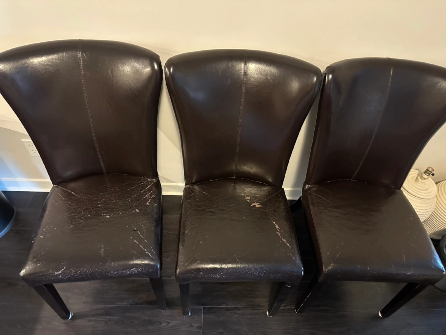 Set of three dark brown leather dining chairs. Features nailhead trim. Some wear and tear visible. Solid wood legs. They are comfy just need covers or perfect for someone who loves to DIY