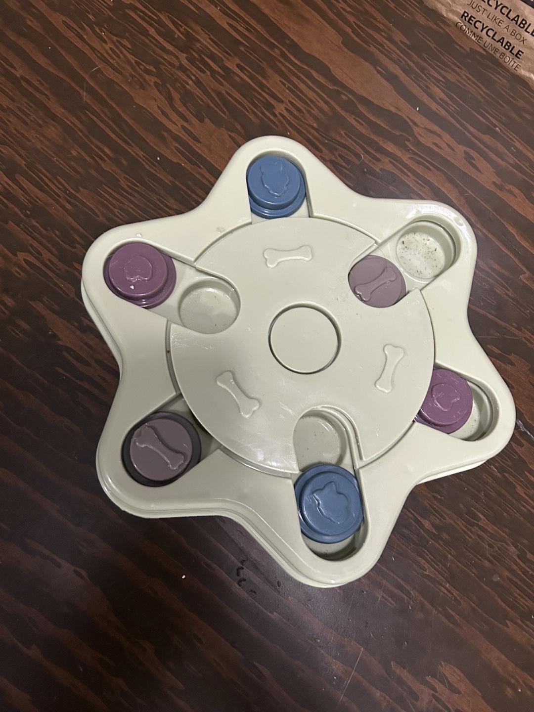 Interactive dog puzzle. Star-shaped design. Features rotating centre and coloured treat compartments. Durable plastic construction. Great for keeping dogs entertained.