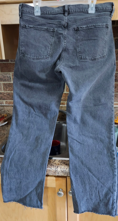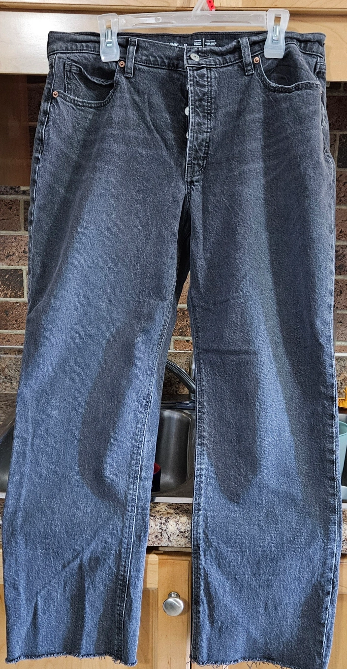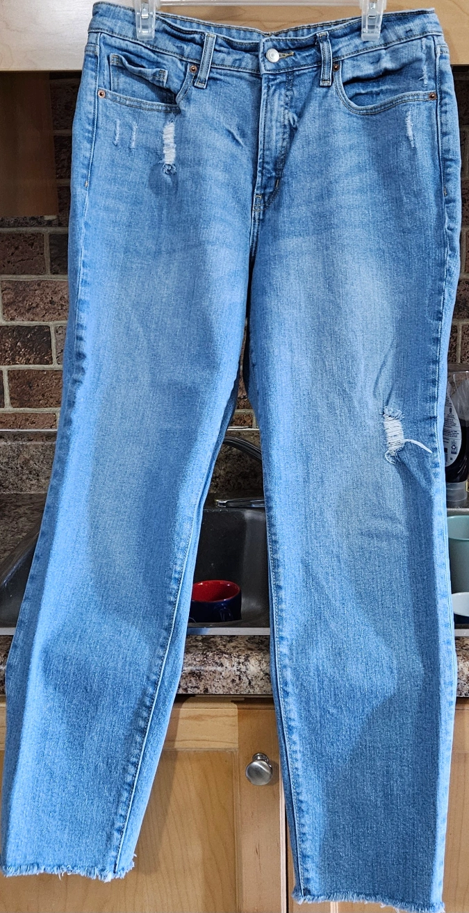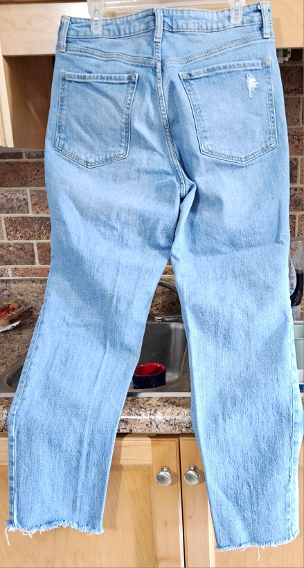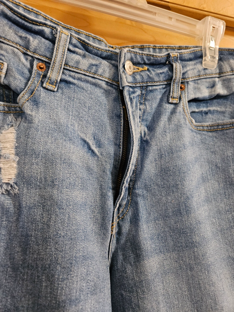 Old Navy women's size 12. One light wash with distressing. Frayed hems. $9 . Blue is zipper fly,
