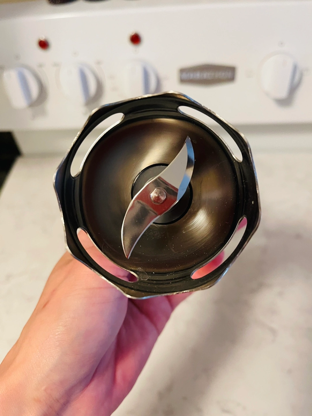 Red Cuisinart Smart Stick hand blender. Two speed settings. Includes a plastic beaker. Dishwasher and microwave safe.