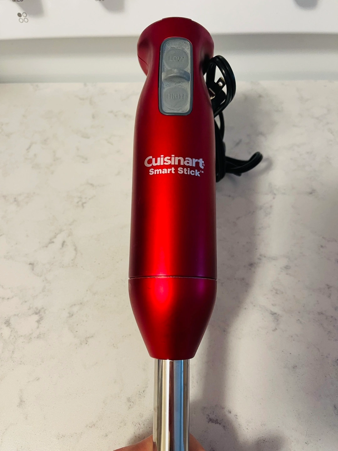 Red Cuisinart Smart Stick hand blender. Two speed settings. Includes a plastic beaker. Dishwasher and microwave safe.