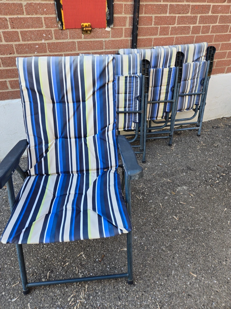 4 blue, beige and white striped folding chairs. Metal frame. Perfect for camping or your patio. Used condition.