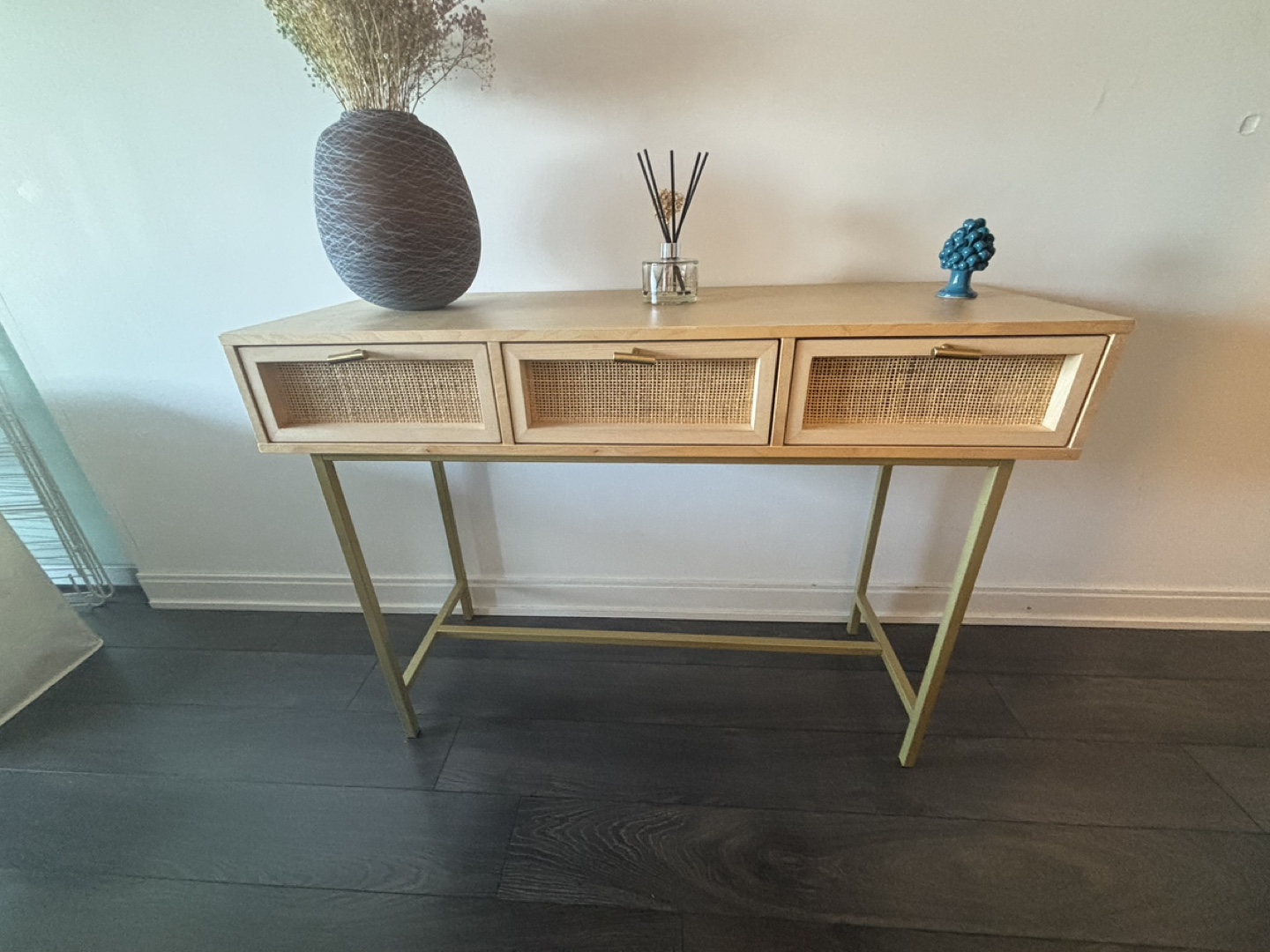 1 / 11 / 1Buy & SellModern Console Table with Rattan DrawerModern Console Table with Rattan Drawer$75Stylish console table. Three drawers with woven rattan fronts. Gold-toned metal legs. Perfect for entryway or living room.WHERE TO MEETYorkvilleView MapSELLERverifiedEMChurch and Wellesley27621 reviews1 chats·1 favorites·70 viewsSEND CHAT TO SELLERHi EM! I’m interested in your listing.Hi EM! I’m interested in your listing.Get the Karrot app to chatSign In to chat
