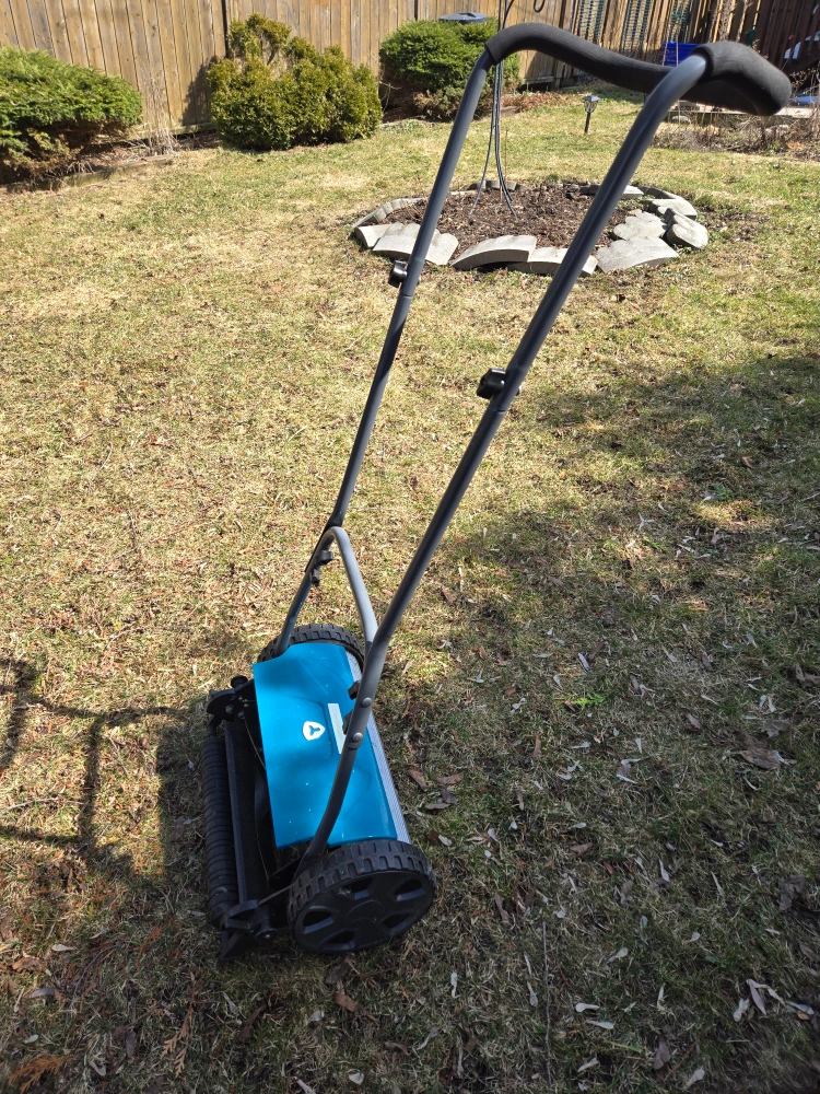 Manual push lawn mower. Durable steel construction. Lightweight and easy to manoeuvre. Blue and grey colour scheme. Great for smaller lawns.