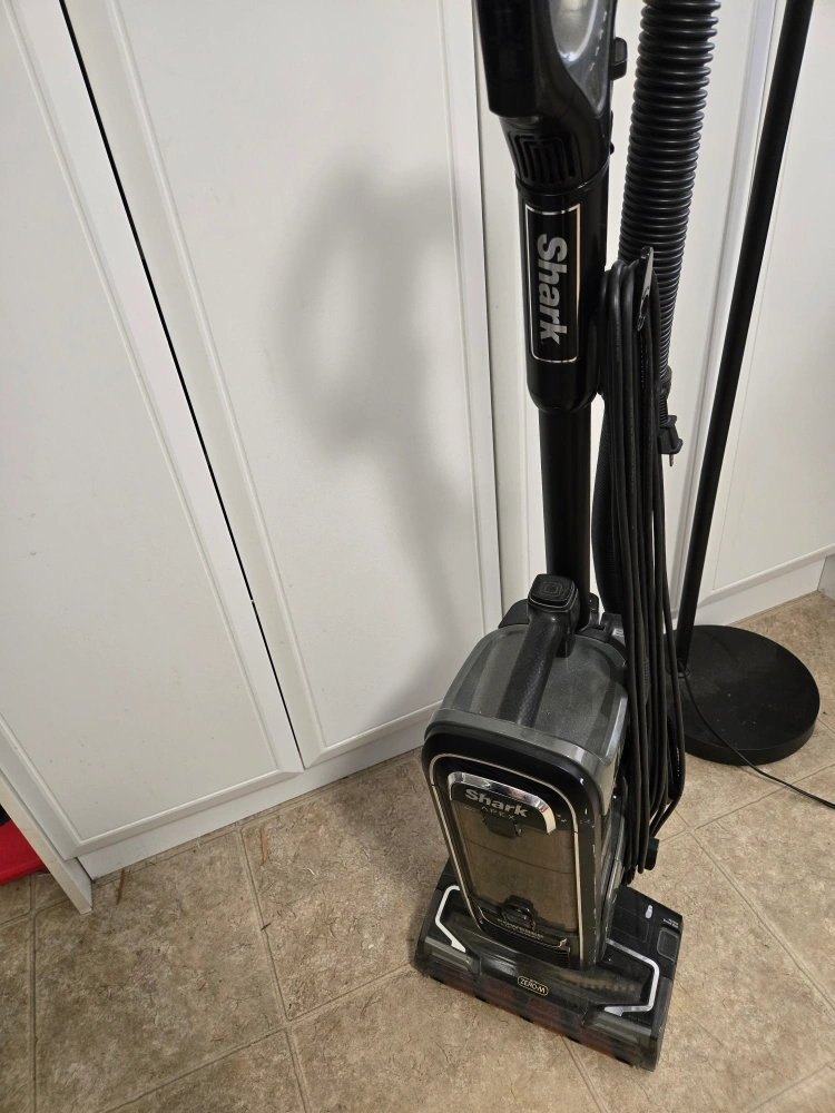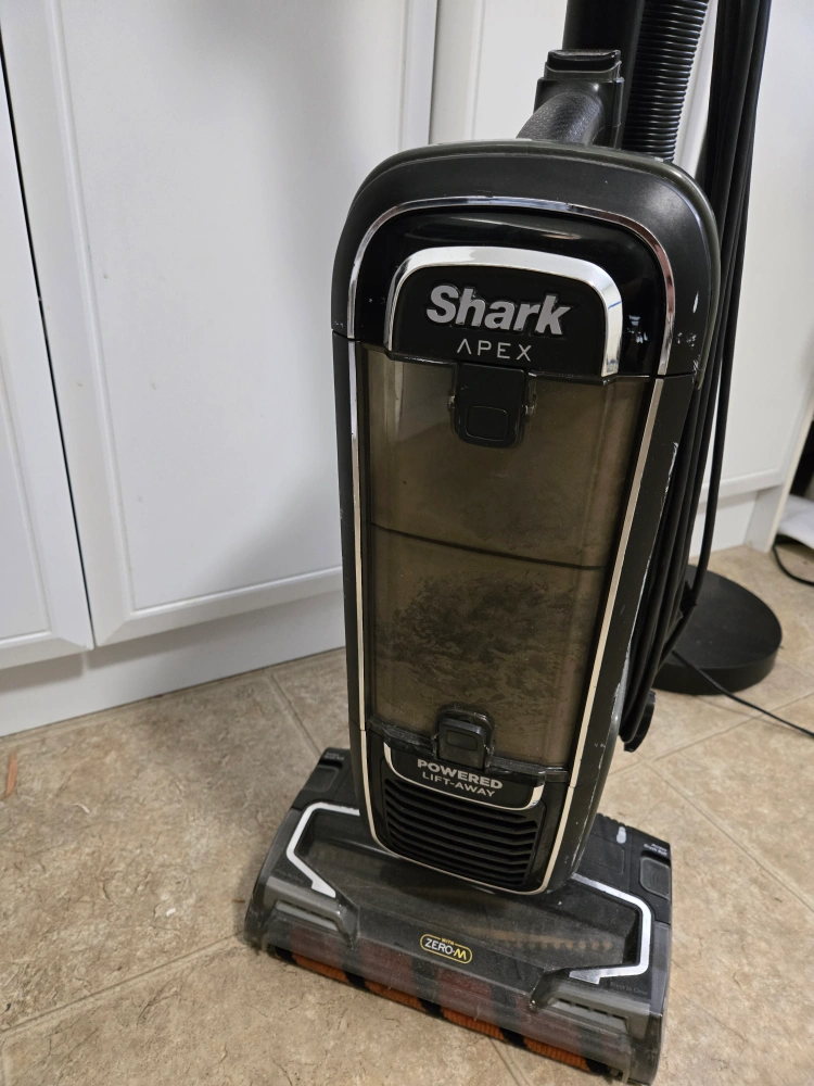 Used Shark Apex upright vacuum. Features powered lift-away technology. Includes attachments. Shows some dust in the canister.