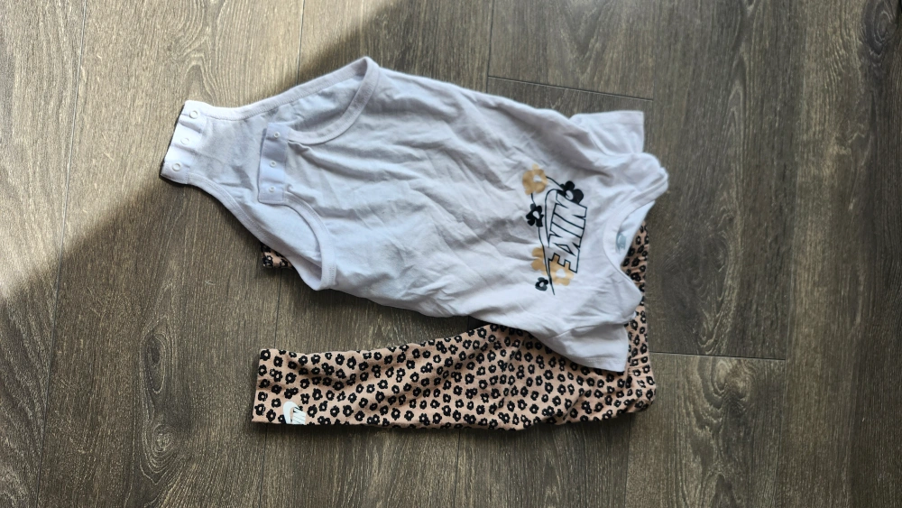 Adorable baby girl outfit. Includes a white bodysuit with Nike logo and floral accents. Matching leggings feature a cute neutral leopard print. Great for everyday wear.