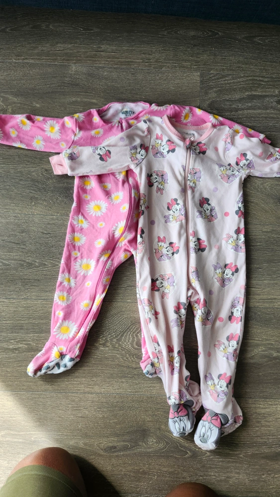Two adorable infant sleepers. One pink with daisies, one pink with Minnie Mouse. Zip-up front. Footed. Great for keeping your little one warm at night.